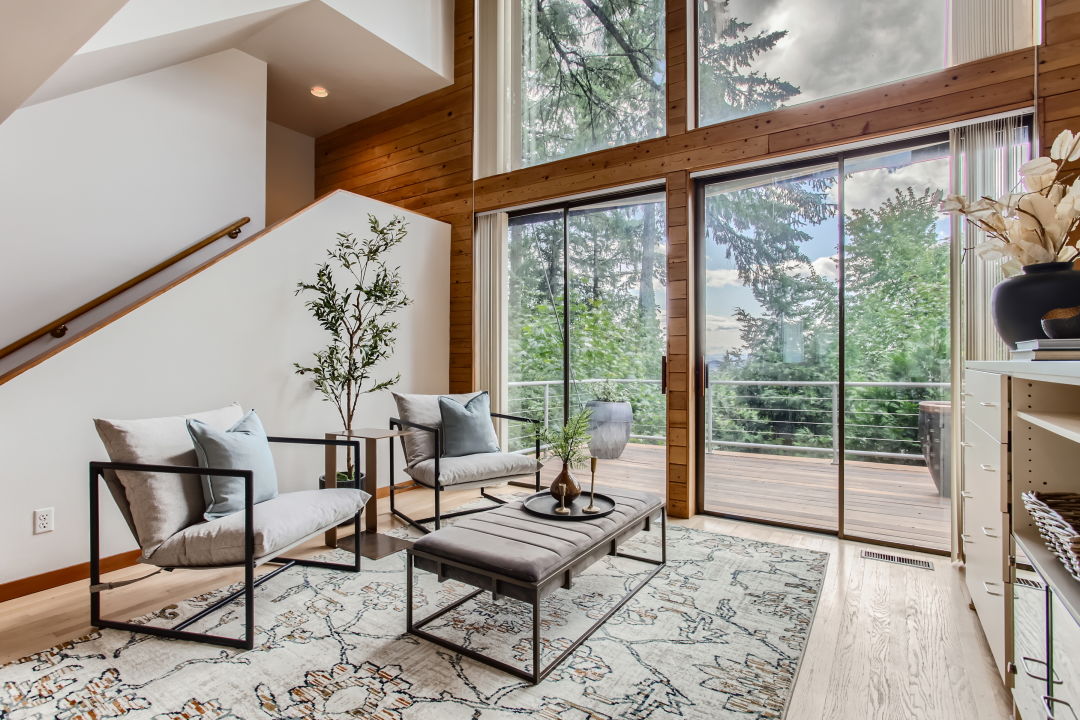 That lookout-tower effect feels even stronger from the home’s three decks. Off the already-spacious living room, a huge wooden platform juts out into the trees, adding 160 square feet of outdoor living space. The smallest deck opens up the primary bedroom through two French doors. Right off the kitchen, a framed-in balcony offers space for alfresco dining. “It's a great condo alternative,” says real estate agent Kelly Sandstrom. “No real yard, just decks with killer views.”