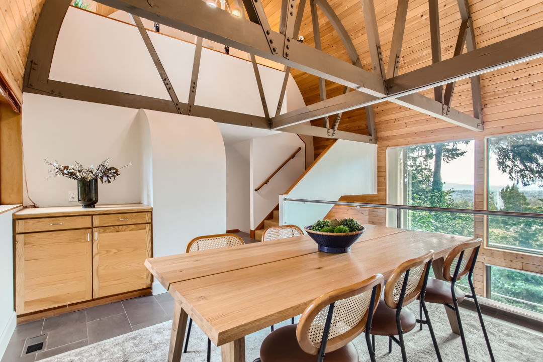 The home’s 2,350 square feet stretch across three main stories. The unusual shape takes center stage in the living room, where one heavily windowed wall rises unimpeded to the rounded wood-paneled ceiling and exposed beams above. This is a space you have to visit—or at least 3D tour—to fully appreciate.
