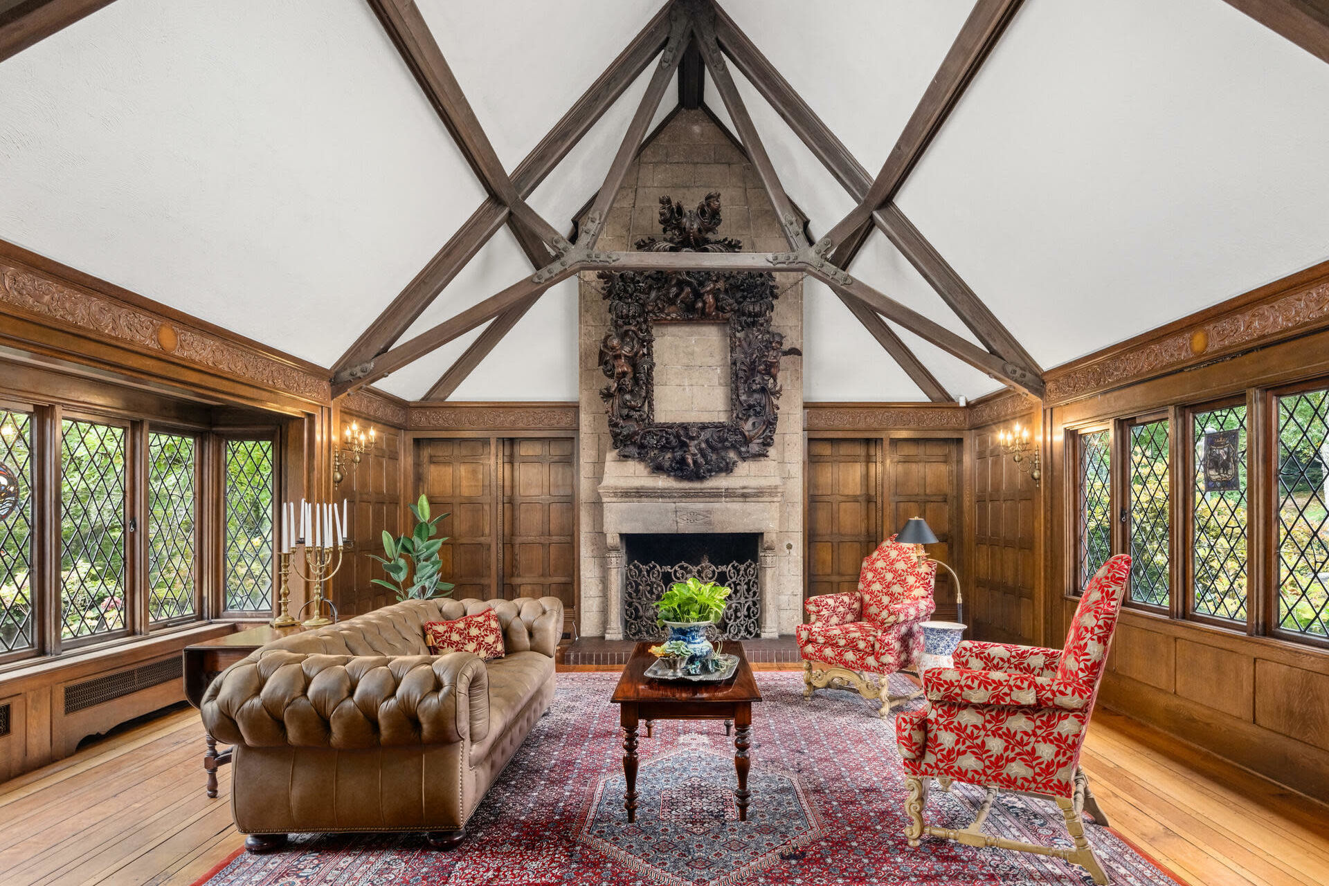 This 1922 mansion on 2.99 acres in Dunthorpe has always been a little hard to describe, probably because it was designed by the original owner, Percy A. Smith, to be a fanciful combo of children's adventure tales and European manor. From the weird to the wonderful, it seemed to have a little of everything, like Latin inscriptions carved into the woodwork and chiseled grotesque faces in the Hogwartsesque speakeasy.