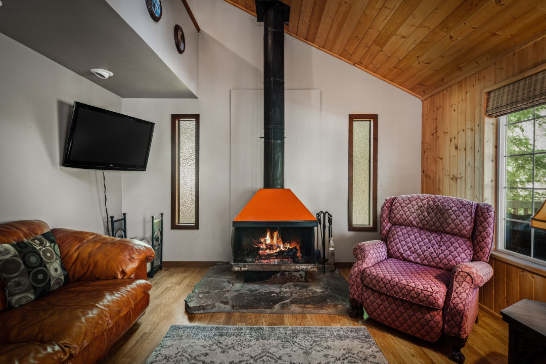 Perhaps that's why, more than ever, we want to appreciate time capsules just like this one: a 1976 fishing cabin in Tillamook, complete with tongue-and-groove knotty fir, a vintage orange enamel freestanding fireplace, and a sleeping loft tucked under the vaulted ceiling.