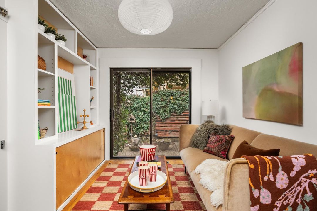 In the kitchen, pea green benches form a breakfast nook at the far end, accented with peachy pink paneling, simple flat-front cabinets, a seriously vintage stove, and butcher block counters. There's a bedroom on this floor, with taupe grasscloth walls offset by trim in British racing green, as well as the home's only bathroom, done in a dapper palette of black hex tiles and white subway tile. An additional flex room rounds out the plan, with built-ins for the TV and sliding-door access to the backyard. Upstairs, the two remaining bedrooms are tucked under sloping ceilings, and just begging for brighter hues to go with the rest of the surroundings.