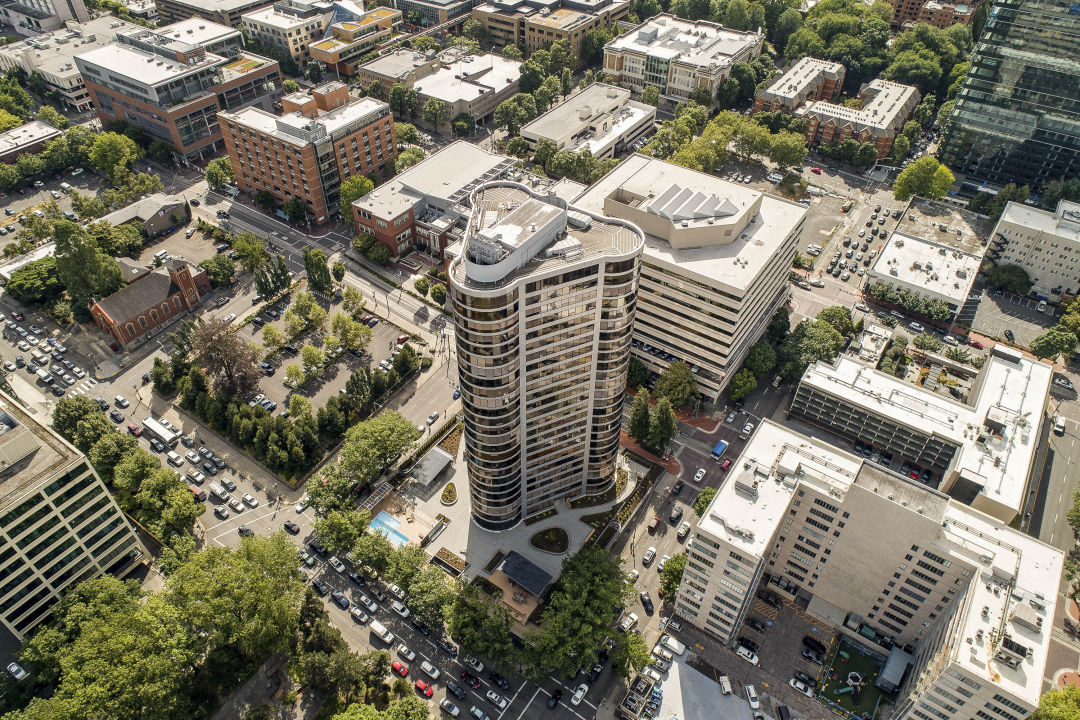 Much was made of the building’s unique shape. Instead of the standard glass box, it’s a triangle, rounded by nodes that pop out at each of its three points to offer 230-degree views for most apartments. Advertisements touted the building as “the shape of things to come,” and buyers bought in. Three-quarters of its 145 units were sold before Senator Mark Hatfield ceremoniously broke ground on the project with a 100-year-old pickax in 1972.