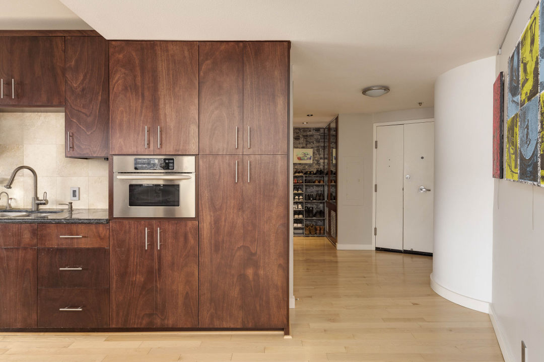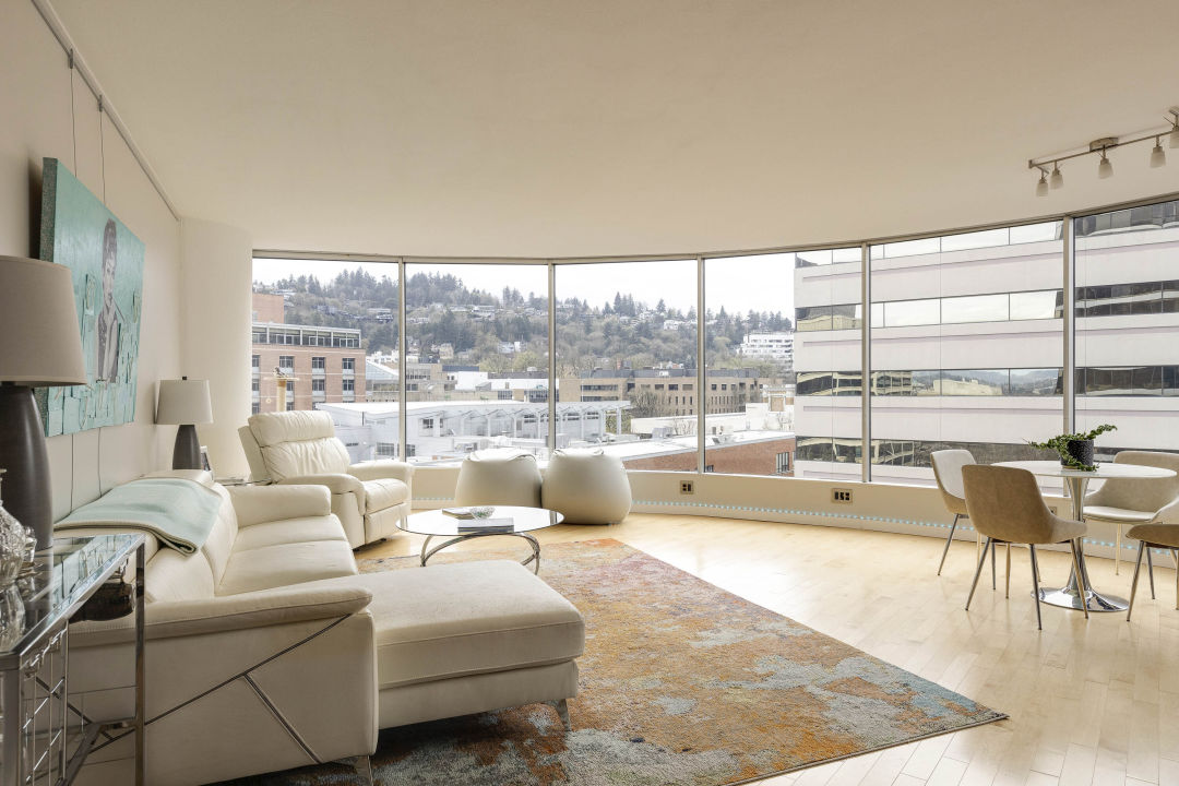The main living spaces are airy, with high ceilings and pale wood floors. The kitchen forms a neat galley, with granite countertops, stainless steel appliances, wine storage, and a breakfast bar with a pass-through window. That leaves the main room and its generous curved wall of floor-to-ceiling windows, which capture views of the trees in the West Hills as well as the concrete and steel forest of downtown.