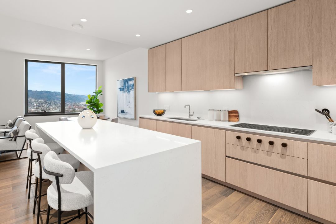 As for the Ritz, the future is now—and, after a January 2026 announcement, it's 50 percent off. Take Unit 2204, the smallest on offer. With 1,052 square feet, one bedroom and two bathrooms, it's going for $615,000, rather than over a million, and with lots of upscale finishes, as expected. Like the engineered white oak floors and Sherwin-Williams "Pure White" walls in the open living spaces. In the kitchen, find custom Pedini cabinetry, a quartzite counter waterfalling over the island, and appliances like a Wolf cooktop and Sub-Zero refrigerator.