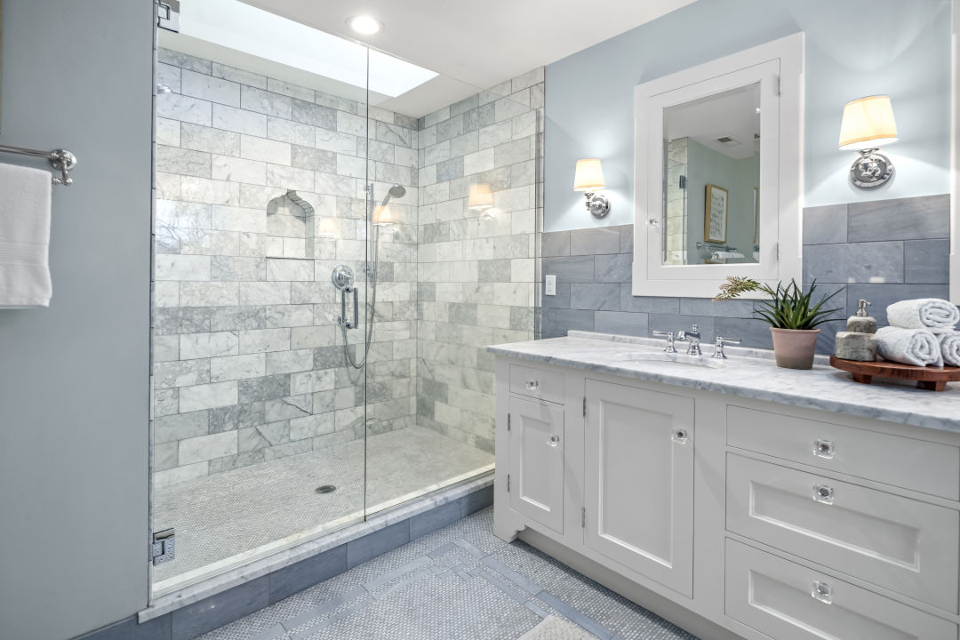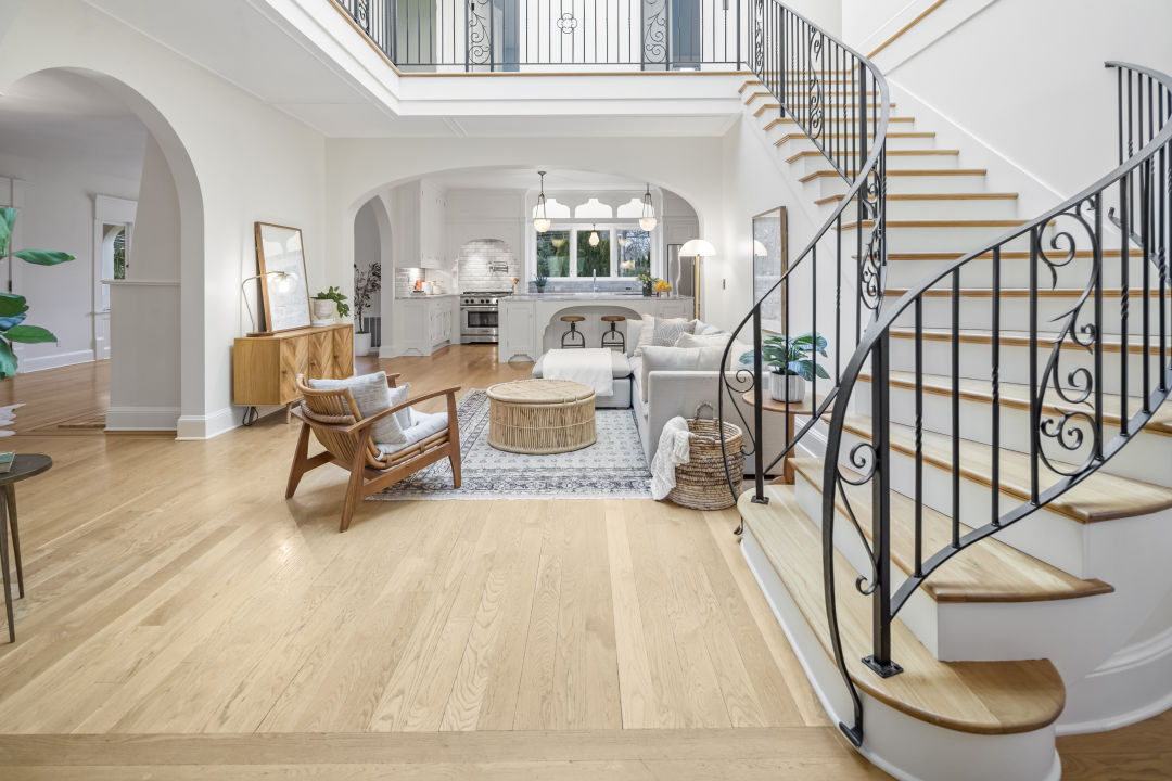 It all comes together at the center of the main floor, where a double-height room capped in skylights floods the interior with light, and arched doorways offer views into the living room, kitchen, and a second family room. Historic style points, like the ornate metal railing on the staircase and balconies above, are mixed with an airy palette, including crisp white walls and pale oak floors. More decorative arches pop up in several spots: framing the stove and sink alcoves in the kitchen, cutting into the base of the kitchen island, and appearing in an art glass window and built-in shelves in the dining room. Even one of the showers has an arched soap niche in the marble tile.