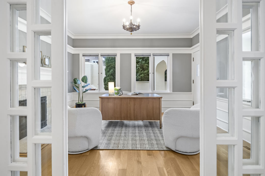 There's no shortage of getaway spots, inside and out. Find a steel pergola in the side yard off the dining room, and an expansive rooftop patio over the new garage. Downstairs there's a fifth bedroom, a bathroom, and two flex spaces that could be customized into a media room, gym, or creative space. A third flex space is on the main floor just off the living room, tucked behind elegant double glass doors, with a fireplace and its own exterior entry. It would make a delightful office, a perfect nod to the house's previous incarnation.