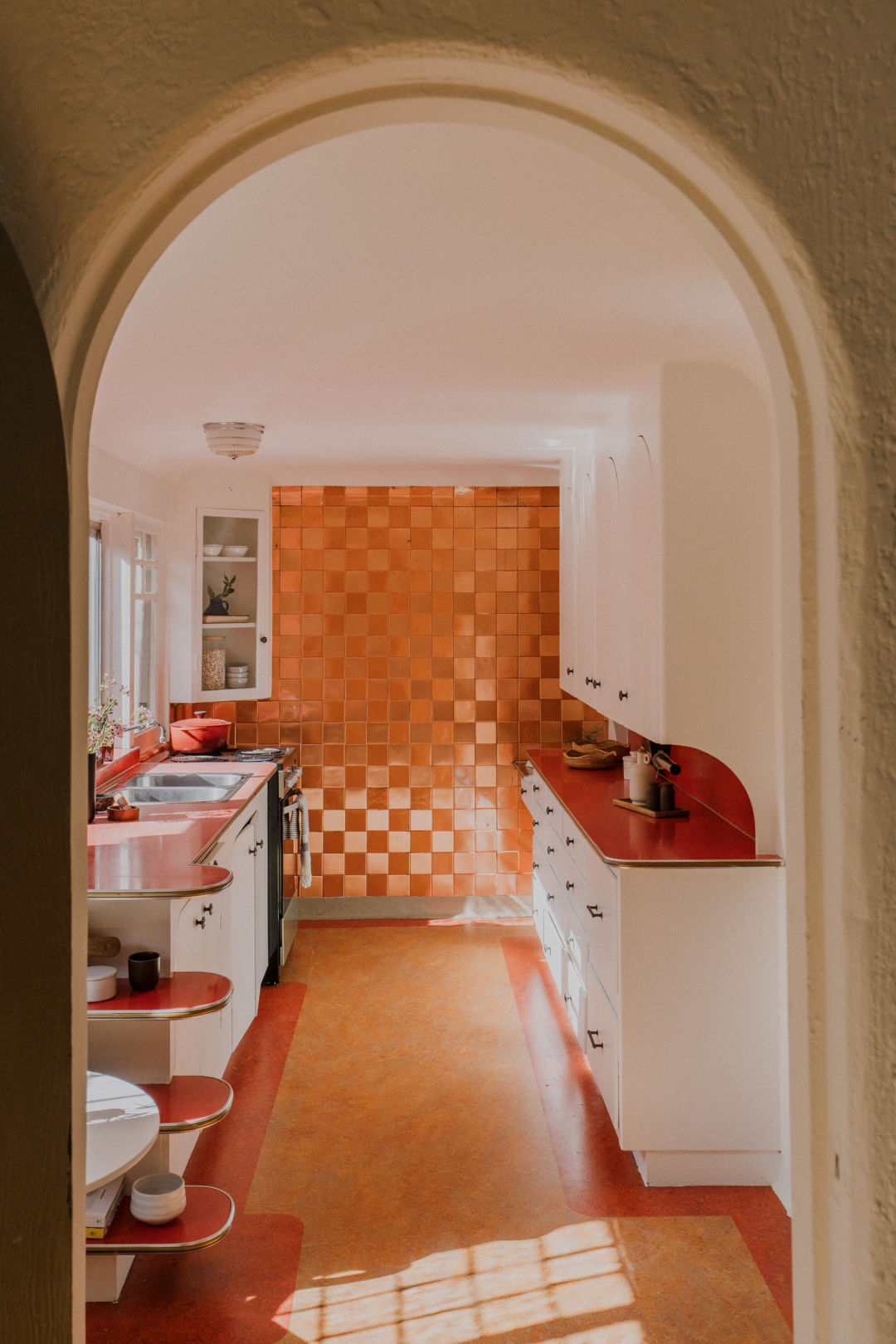 More craft awaits through an arched door and down a step into the kitchen. Inset cabinet doors are gently rounded to match the arch motif throughout, as are the scalloped shelves separating the cooking area from the adjacent dining nook. An accent wall covered in gleaming copper tile picks up the light from the windows and looks right at home with the red countertops and rust-colored floors. The refrigerator—a hot topic online—is cleverly set into an alcove and out of sight from certain angles.