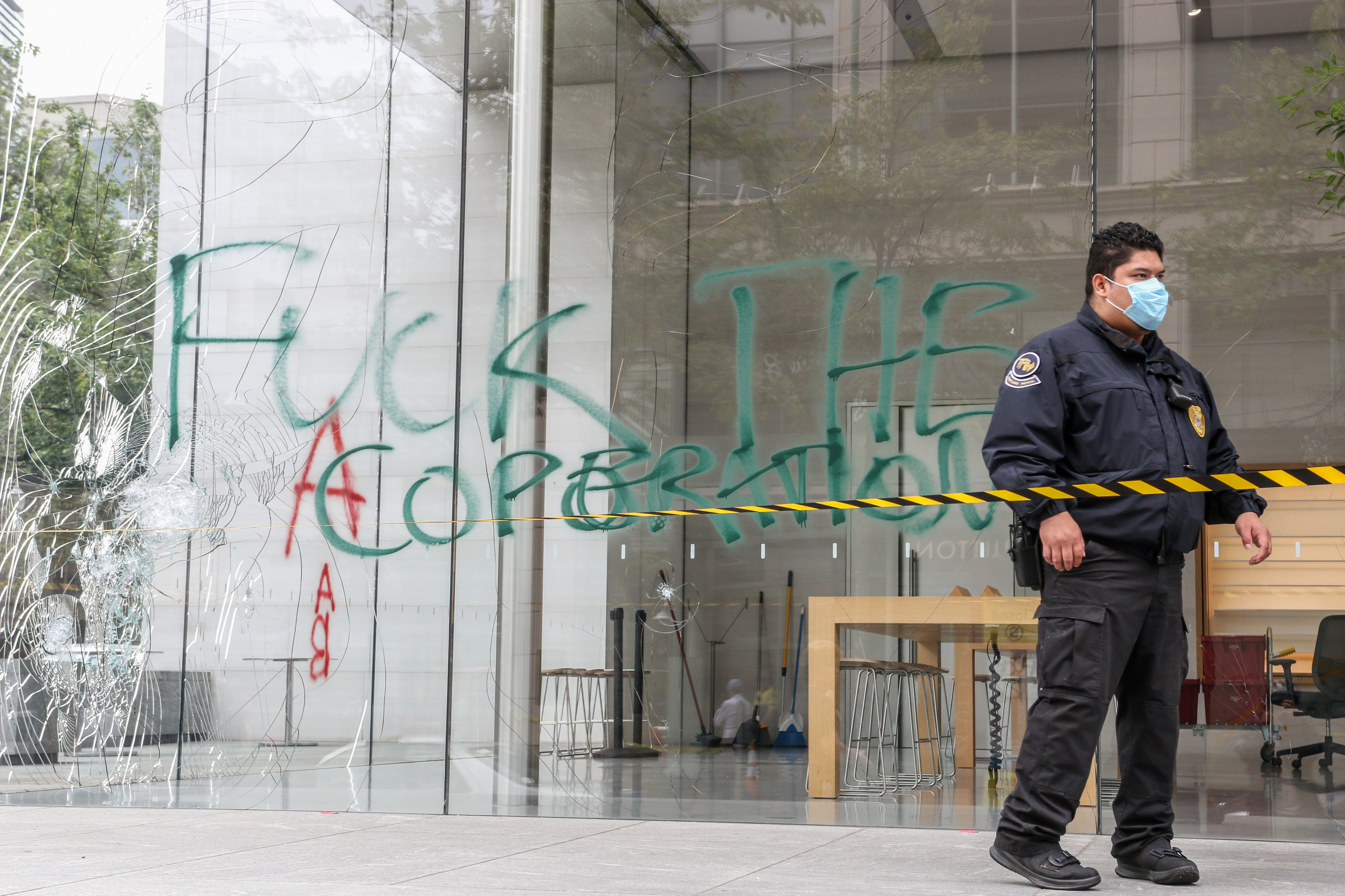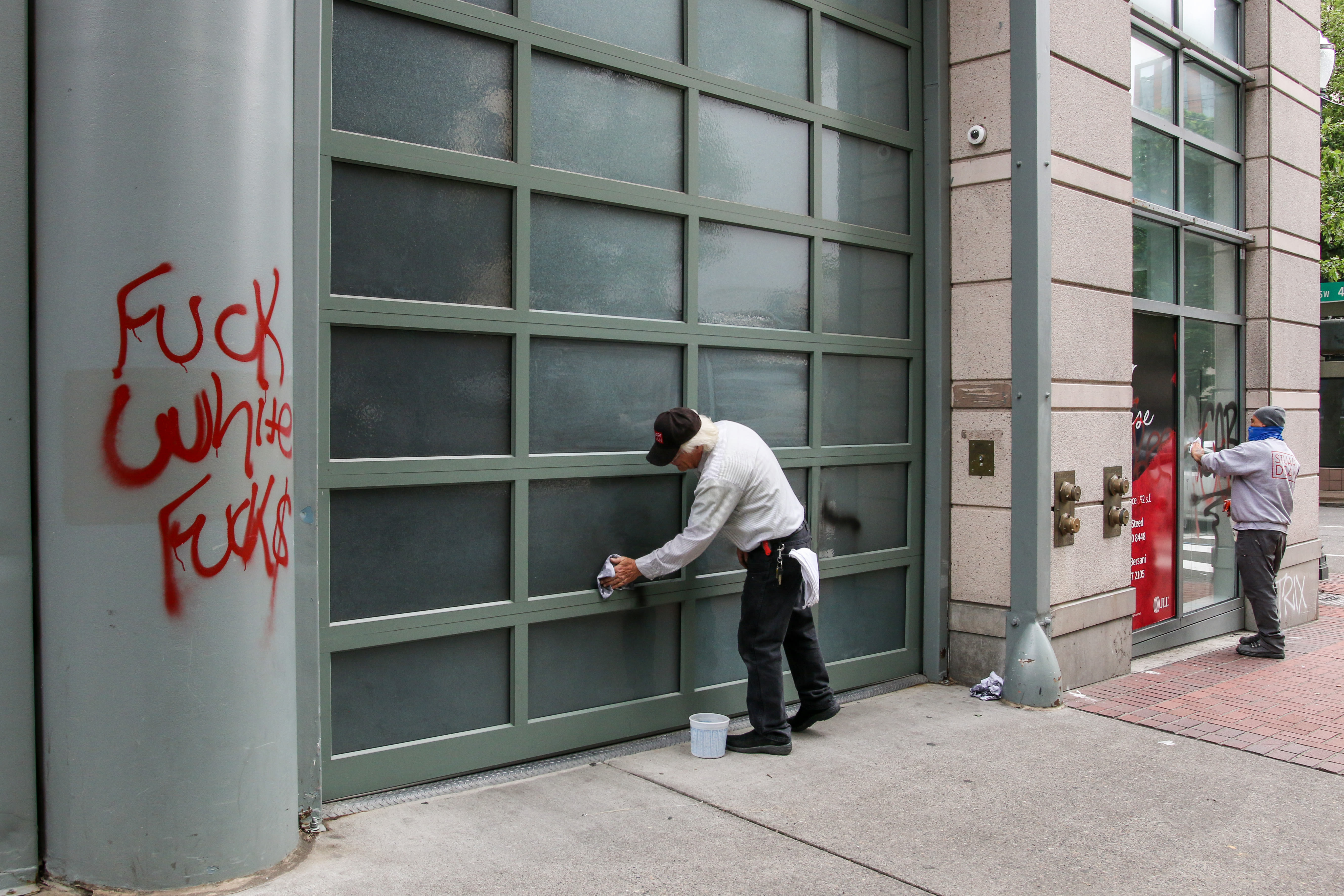 It's a fairly typical sight on Saturday morning, before the ever-looming pandemic, to see faces behind cell phones and selfie sticks, documenting the cityscape. But Saturday, May 30, the morning after the demonstrations in memory of George Floyd erupted in violence and arrests, was anything but typical: clean-up crews sweeping shattered glass off of cold concrete, men in yellow vests and red bandanas power washing graffiti from marble exteriors, sirens swirling and echoing through the streets.
