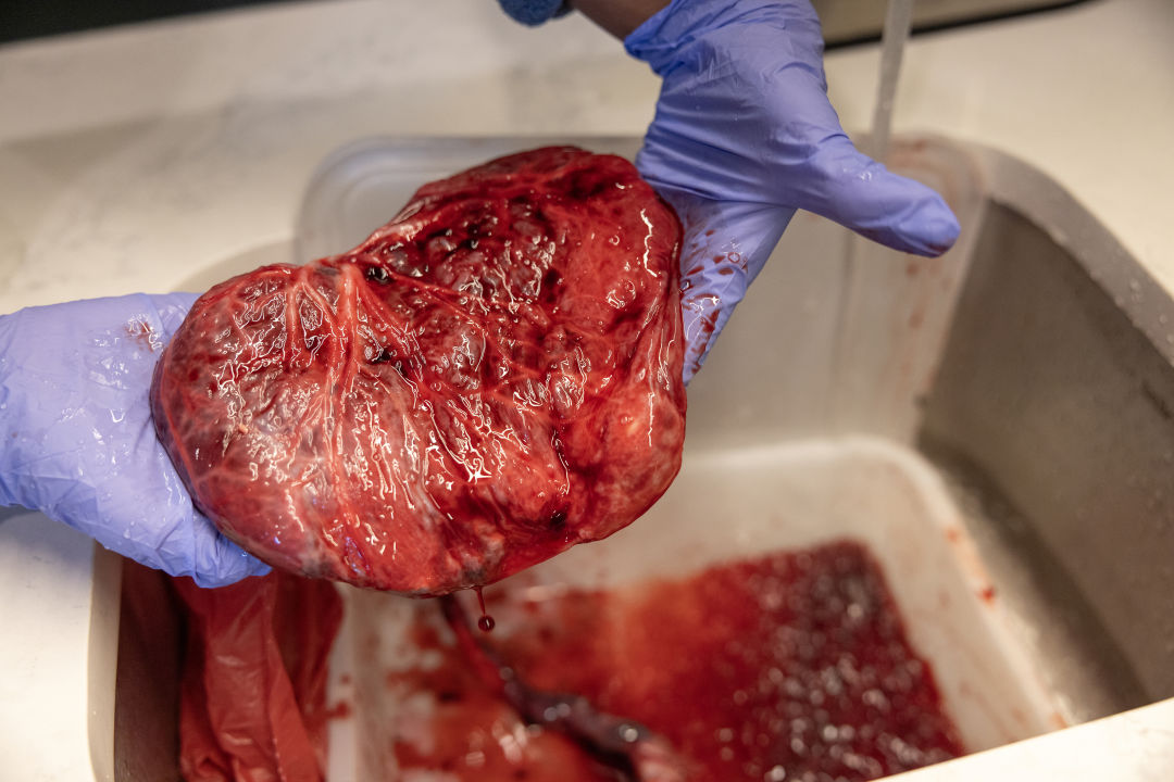 But since 2019, Berthrong has had access to a trove of material that is disposable, free, and abundant: placentas. Thanks to a program spearheaded by a Portland doula named Camilla Rae, families from around the metro area can donate their placentas, which Rae stores in a freezer at her home. She and Berthrong meet in a parking lot of a Home Depot midway between their homes for a handoff every few months. Equipped with as many placentas as she could ever need, Berthrong uses the remnants of birth to find the remnants of death.