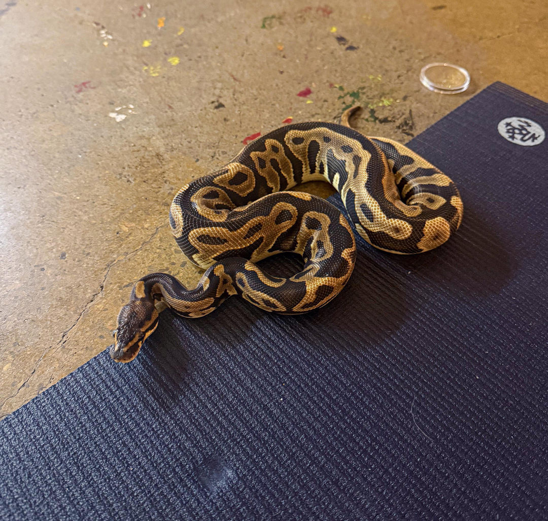 Vanek taught her first snake yoga class in October. It was an instant hit. Monthly classes were selling out even before The Oregonian coverage brought a spike in interest, and the shop now runs snake yoga three times a week, with a small stable of instructors. Each session features several snakes alongside other reptiles: perhaps a mellow bearded dragon named Miso, a striking Argentine black-and-white tegu lizard named Diamond (he belongs to Morales), or an Aldabra giant tortoise named Pebbles (also Morales’s). Hisss employees serve as handlers, watching for signs of stress and moving animals through the room. All students receive little consent tokens, allowing them to accept or decline visits.
