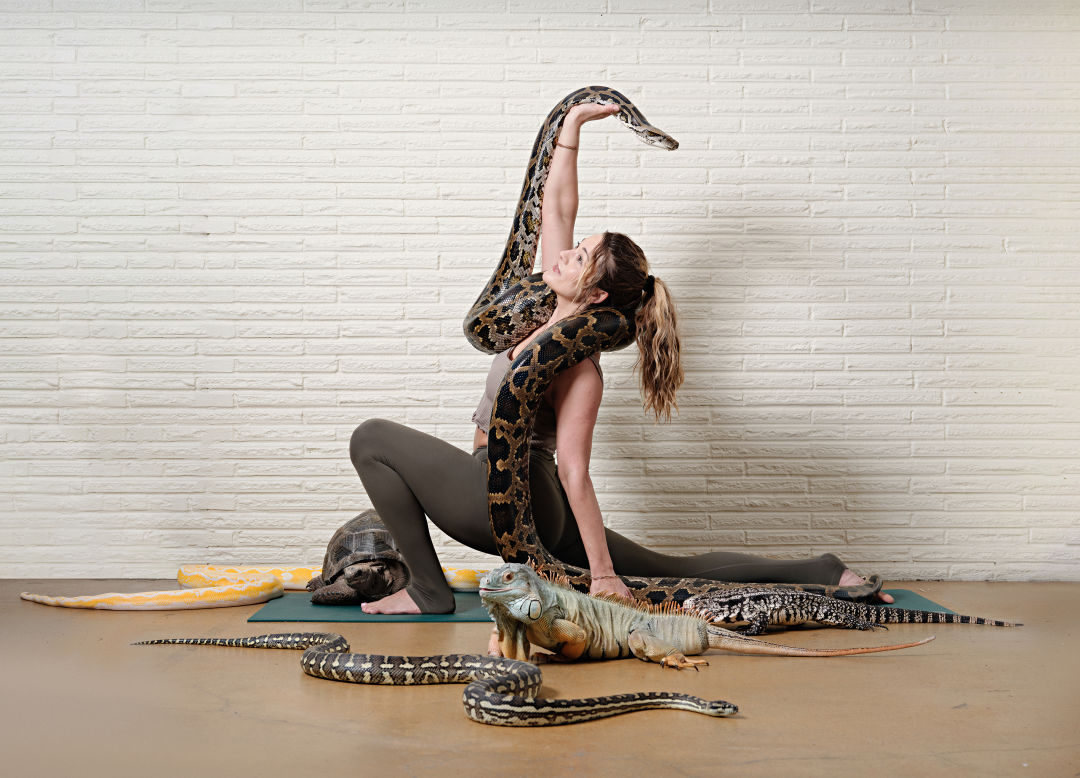 Hisss owner Dru Morales did not set out to launch the latest animal-based yoga trend. He was simply seeking ways to gather people at his shop, which opened last August, and he reached out on Instagram to a yoga teacher named Katy Vanek. She’d led classes with kittens and dogs but wasn’t immediately sold on snakes. “I definitely hesitated for a day,” she says. When she visited the shop, Morales placed a ball python named Diana in her arms. Vanek expected frantic wriggling. Diana was as calm as could be. “I was like, Wow, she’s kind of like a dog,” Vanek says. “She’s just hanging out.”