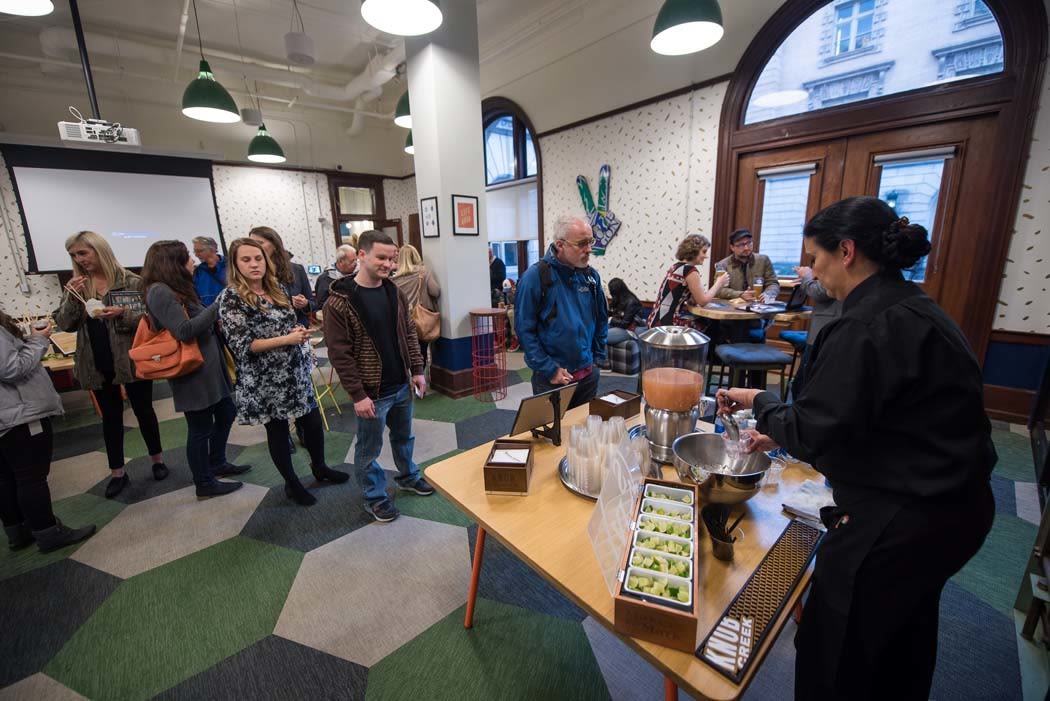 Presenting sponsor Blue Moon added color to the party with a mural and beer glasses for guests to paint; ChefStable showed off their innovative dishes, and their special guest, Jasper Shen of XLB, brought the perfect comfort food for a rainy night. Out West played bluegrass through WeWork's uniquely Portland venue, Stoller Family Estate kept the wine flowing, and astrologer Julia Bray read horoscopes and tried to determine the most creative sign. And, of course, no Maker Mixer would be complete with out a Maker's Mark whiskey tasting with Jim Beam.