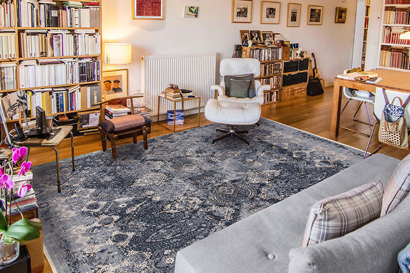 This room maintains a cozy vibe while the rug’s blue-gray hues echo fall’s cooler temps.
