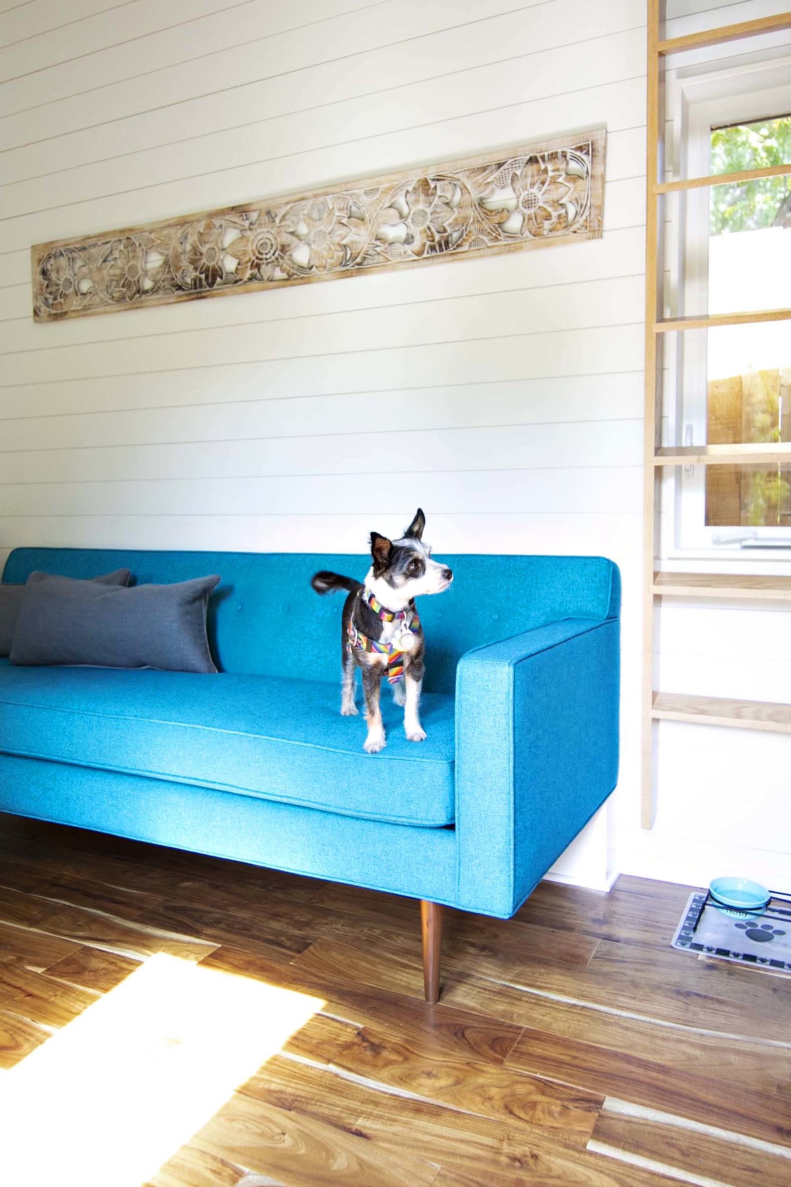 The family couldn’t buy any old sofa from a regular shop because their couch needs to sit on top of the trailer’s wheel-well to save space. So, they chose to work with local custom furniture store, Perch Furniture, to design a sofa that perfectly fits in its allotted spot. Extra-tall front legs and adjusted dimensions allow the full-size sofa to provide plenty of seating while maximizing space. “We didn’t want to put it in front of the wheel-well because we’d lose too much space,” Taylor explains. With a kid, a dog, and a small space, choosing a durable and stain resistant fabric was also key. Perch helped guide Taylor and Meghan towards a fabric that met those requirements and added a great pop of color to their bright, light space.
