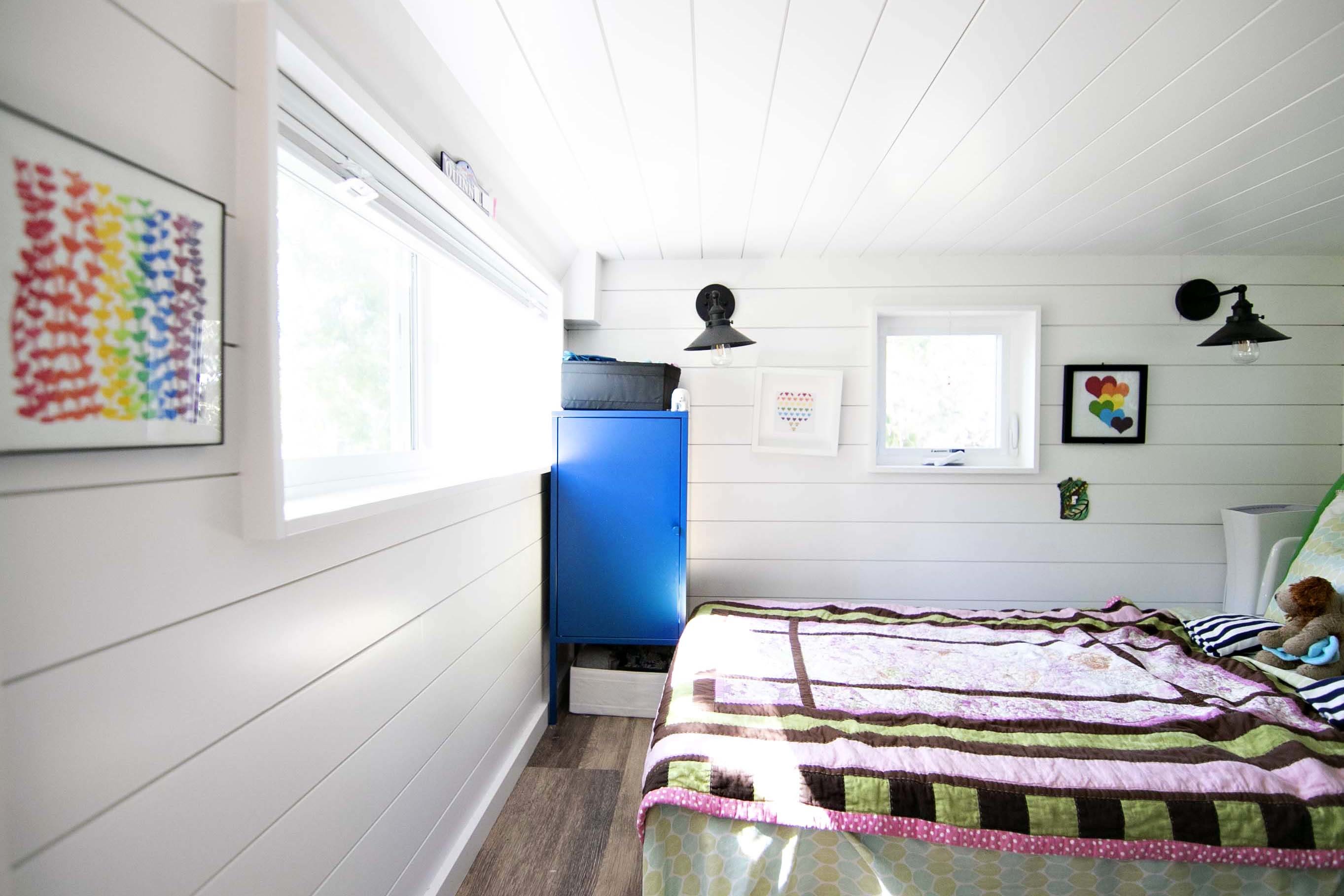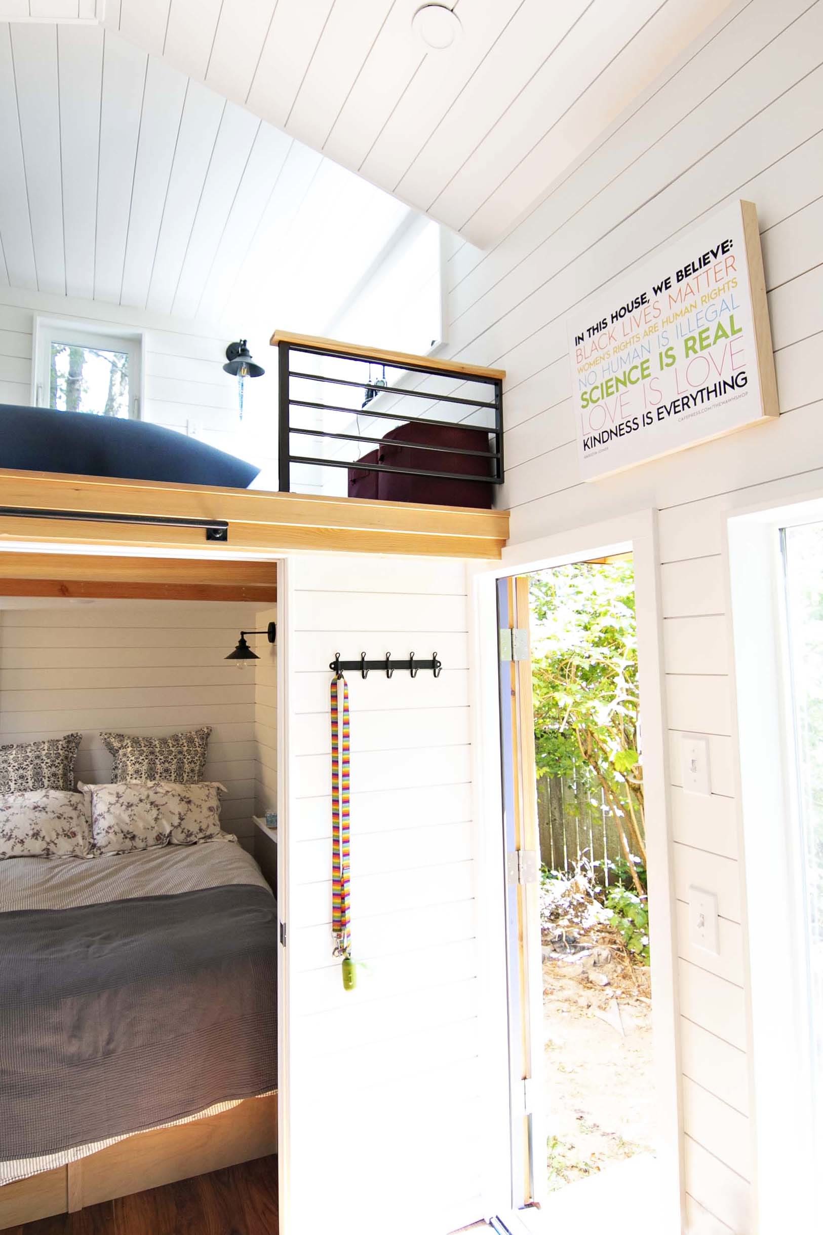 The Perch sofa is at the heart of the tiny home, in the main living space that also includes a full kitchen and a collapsible multi-purpose table. Quinn has her own private bedroom at the top of the staircase, while pocket doors can be closed to separate the main floor bedroom from the living area. “It’s really fun when you’re inside and the doors are shut because it feels really cozy,” says Taylor. Lots of natural light and little bedside shelves that the couple added make the main floor bedroom an enjoyable, usable space for the entire family.
