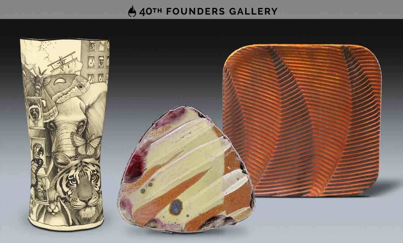 Dennis Meiners is one of those founders whose work has progressed from traditional to conceptual. In recent years, he has decorated functional pieces using a combination of illustrative techniques – Mishima drawing overlaid with metal oxide washes. His complex imagery communicates his views on climate change and the impact of global industrialization. At this year’s 40th anniversary, his vase ‘Asking to Stay’ – which shows a variety of animals juxtaposed with a crop-dusting airplane and cityscape – will be featured in the 40th Founders Gallery alongside work from over 40 of the original members.