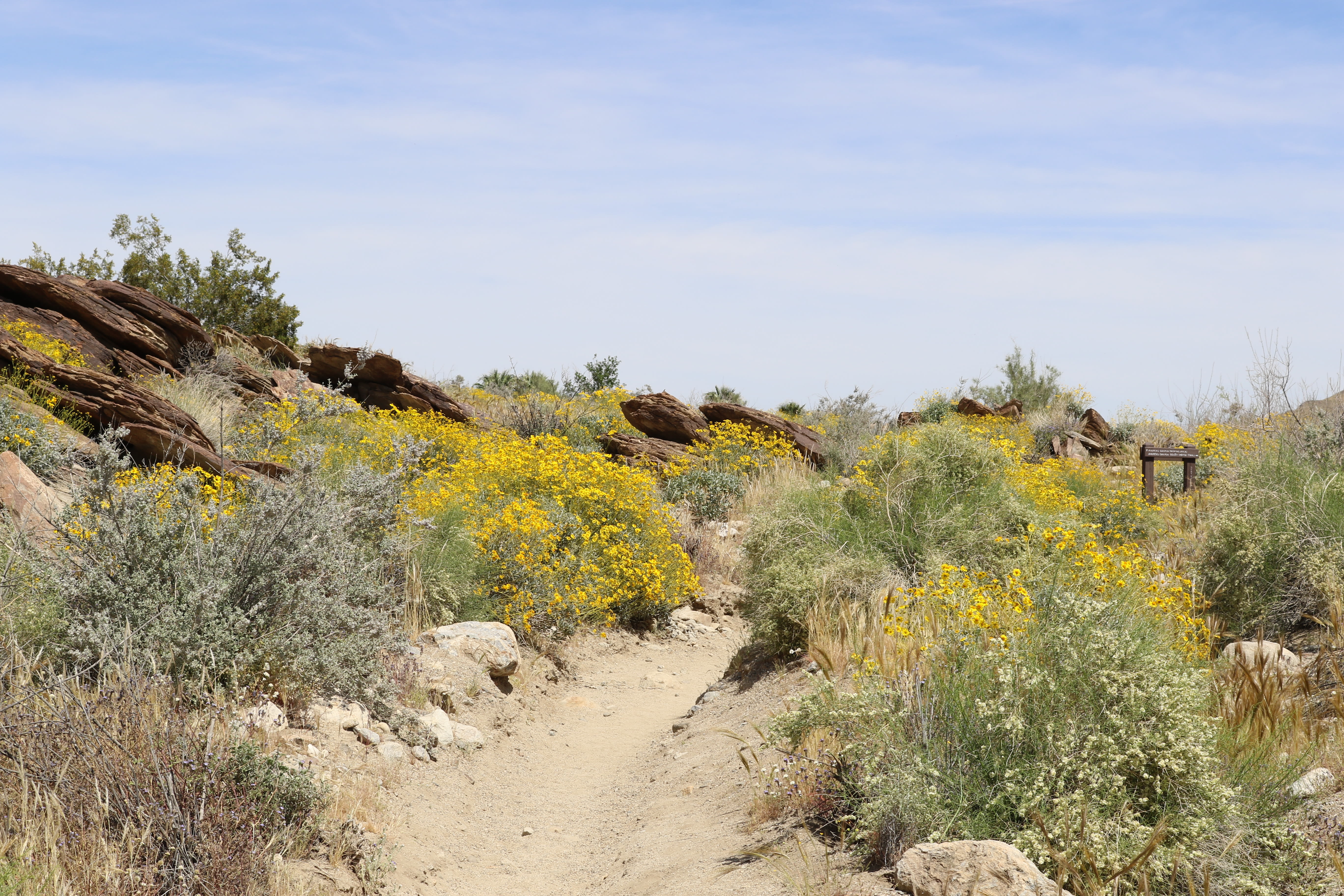 Beautiful yellow brittlebush flowers dot the trail through Murray Canyons in the Indian Canyons in Palm Springs