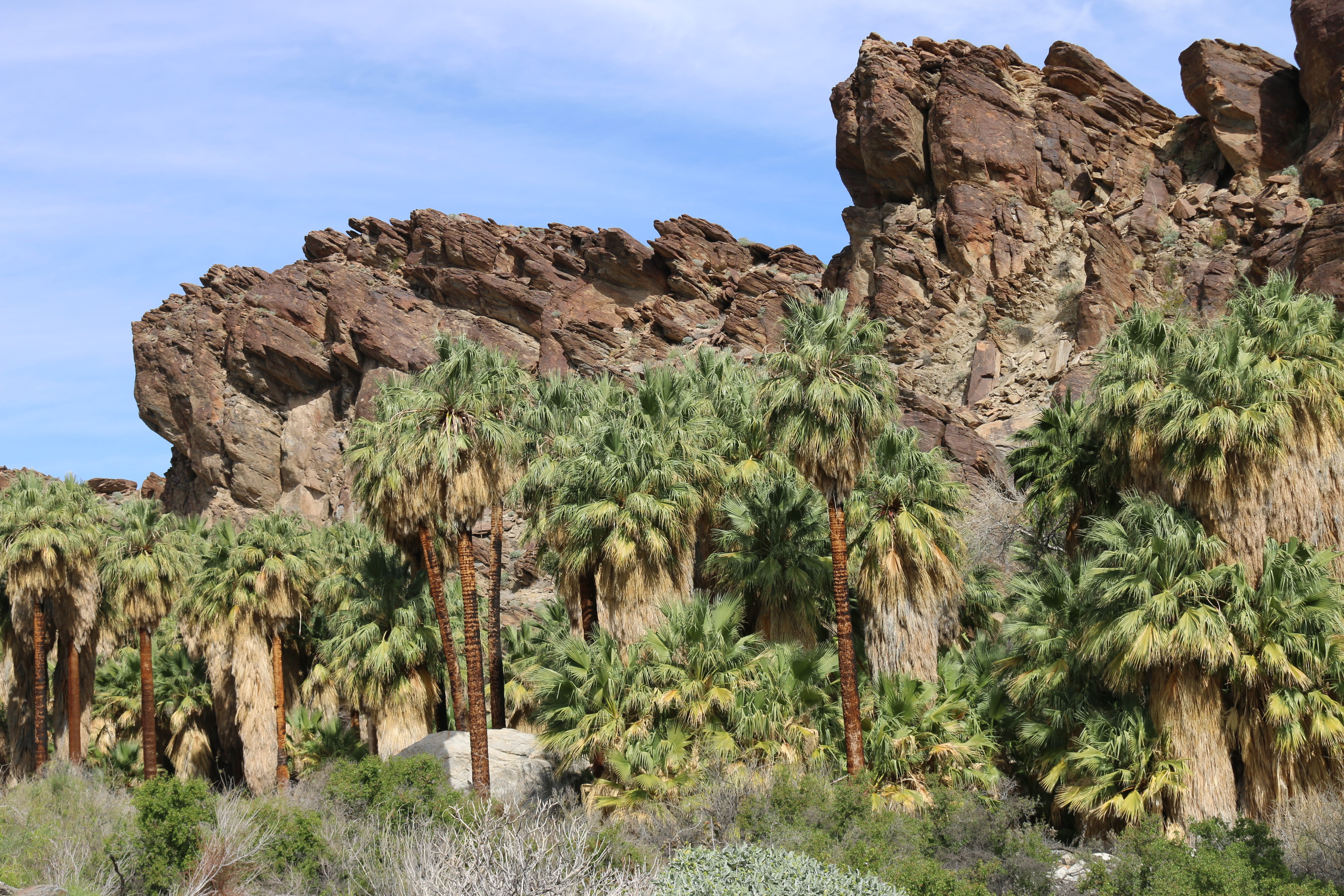 The contrasting greens of the magnificent palm trees and more than 150 species of plants within a half-mile radius beckon the desert traveler to this lush oasis. A scenic foot trail leads through the canyon passing groves of stately skirted palms, unique rock formations and the seasonal Andreas Creek. One can still see the bedrock mortars used by the ancestors of the Agua Caliente people to prepare food. This tranquil setting is excellent for bird watching and enjoy the sounds of nature