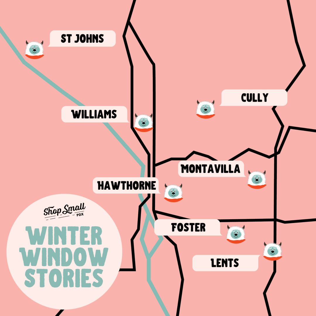 Portlanders love their neighborhoods and communities and Shop Small PDX Winter Window Stories are the perfect way for families and individuals to share a uniquely Portland experience this winter. After enjoying each window installation, take some time to walk around the neighborhood – stop into local shops, grab a bite to eat at a new restaurant, or warm up with a warm beverage or sweet treat from a local coffee shop or bakery.