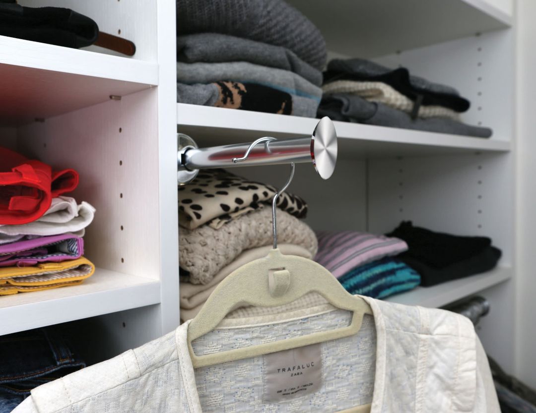 A bench, chaise, or pull-out shelf all fill the basic need of having a flat surface on which to work. Then there’s the simple valet rod — a retractable pole where you can hang clothing choices, especially if you’re a visual learner who likes to picture a potential outfit itinerary for upcoming adventures. (This can also double as a Sunday evening organizational tool when laying out the week ahead for your kids’ calendar; think of school outfits, sports uniforms, and whatever else the weekdays entail around your household.)