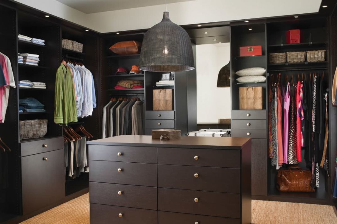 Closet islands can come with dreamy features like sleek countertops, a bounty of drawers, and their own hanging light fixtures, making this little room a pretty lovely space in which to get things set for your approaching departure.