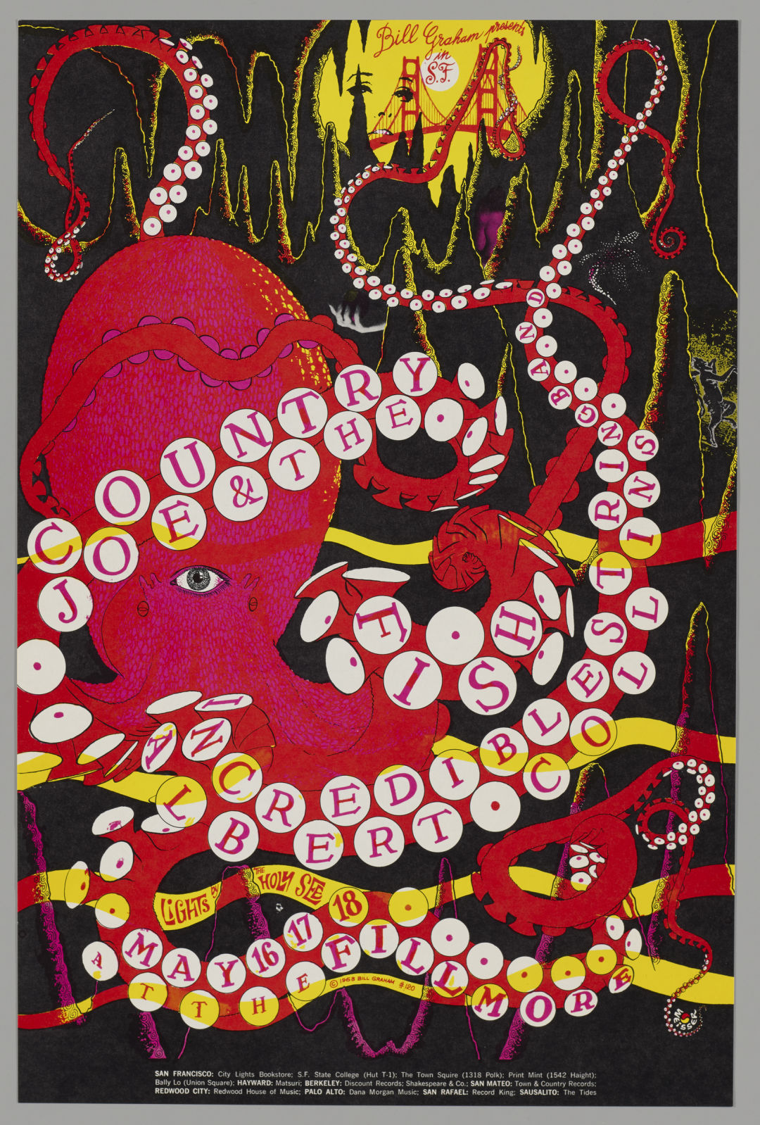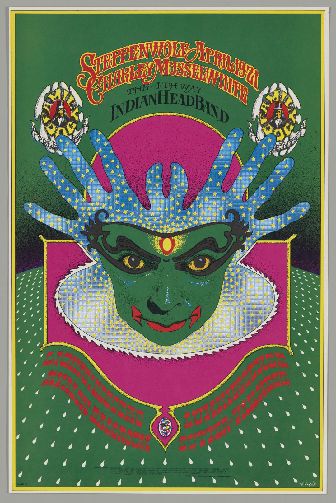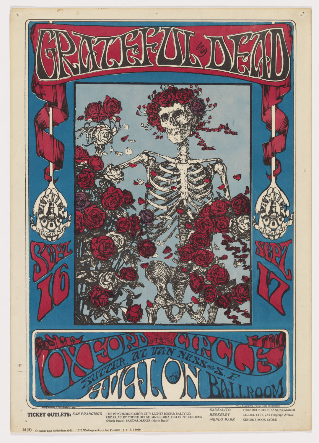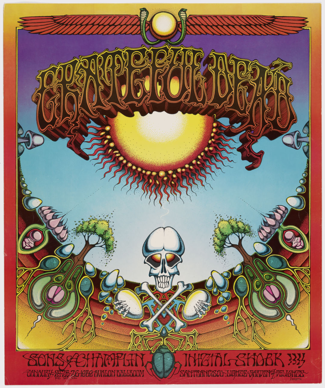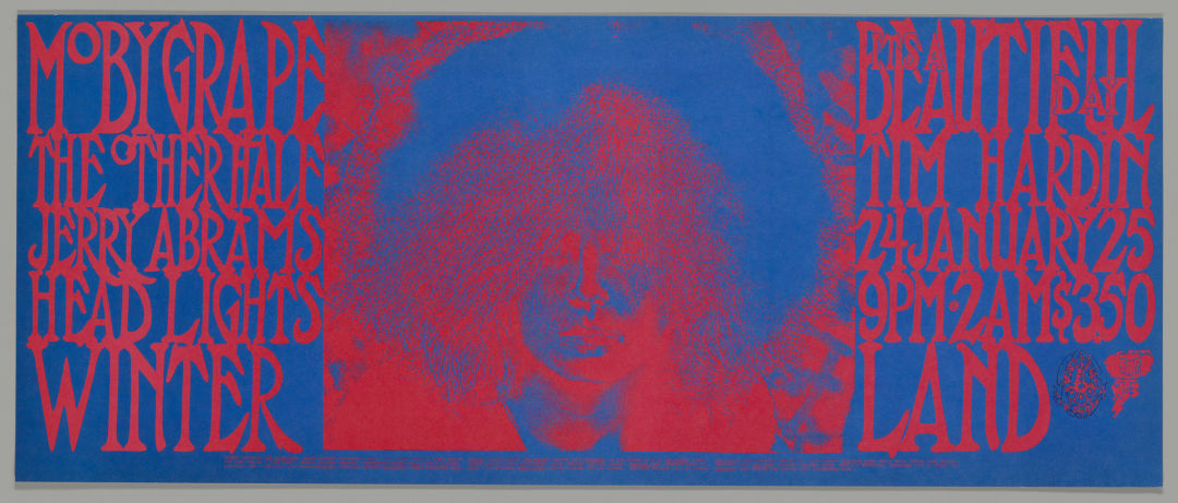 That was quite a challenge! Visitors will see that while artists borrowed existing imagery from Eastern religion and Christian symbols to suggest a mystical state, they had to push their own imaginations to define something even more mind-altering. Rick Giffin fashioned flying eyeballs; Wes Wilson, Bonnie Maclean, and San Andreas Fault (Tad Hunter) depicted expanding, morphing, mind-bending heads; and Stanley Mouse and Alton Kelley created their iconic “Skeleton and Roses” poster for the Grateful Dead to suggest a realm beyond the living. The list goes on.