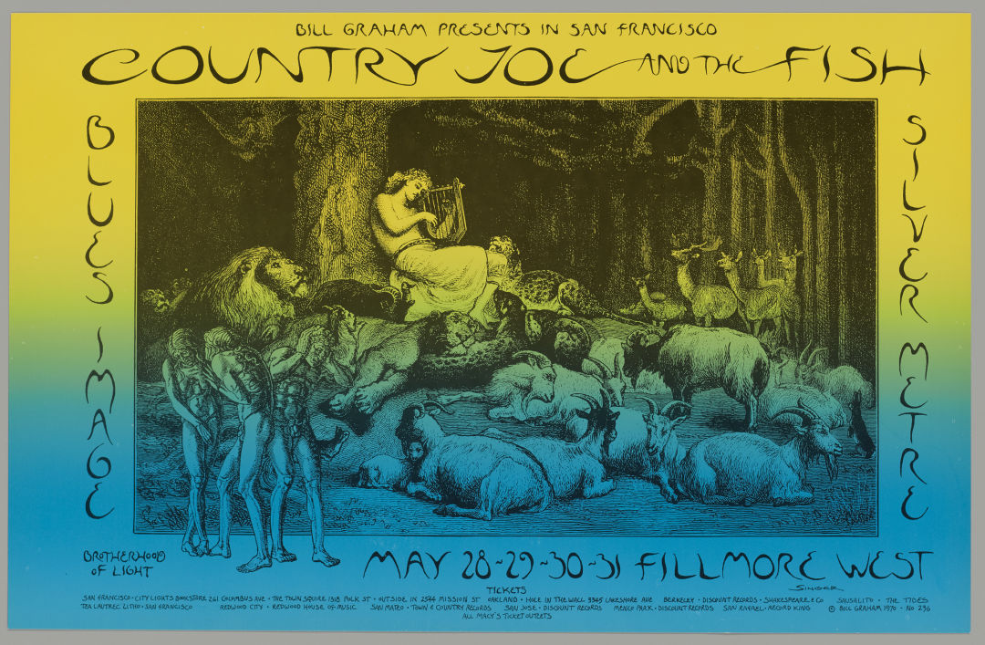 Mary: An excellent place to start! As the exhibition began to take shape, I sorted the images by various themes and I was struck and delighted to discover the number of cats that appear in the rock posters, mostly in the work of Robert Fried and David Singer. I’ve had the pleasure of corresponding with Singer, and he agrees that cats are the most psychedelic of all creatures, as they seem to be peering into realms unseen. Visitors can expect numerous trippy kitties and tigers in this show.