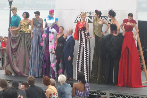 Thanks goodness for Saturday night’s fashion week finale. After that many shows, people, photo editing, writing, elbow rubbing, etc. I was in such desperate need of pizazz I just kept coating on hot pink lipstick to try and rev up. But, thanks to a little show called Project Runway, we managed to get some pizazz out on the runway and I gave my clown lips a rest.