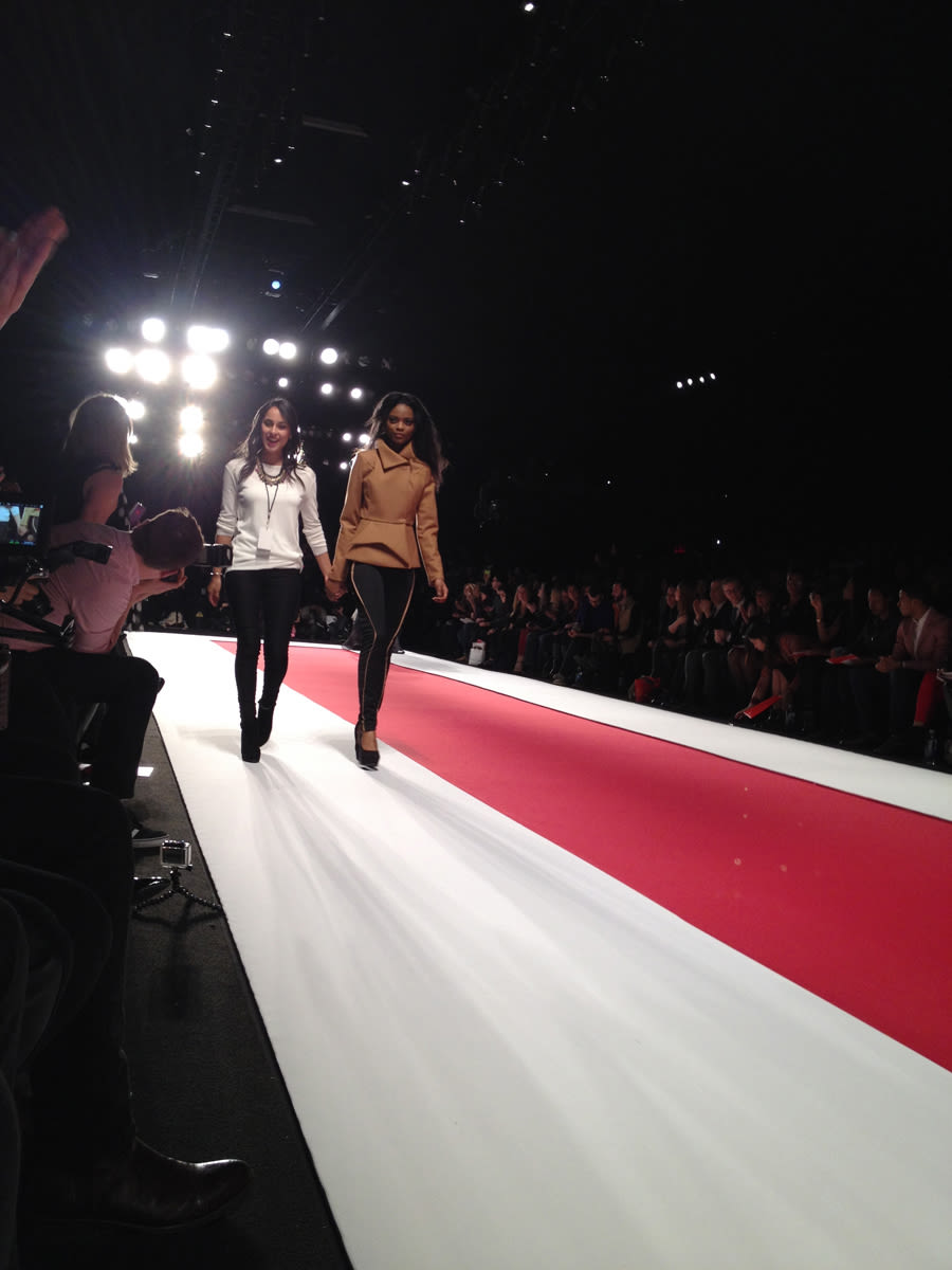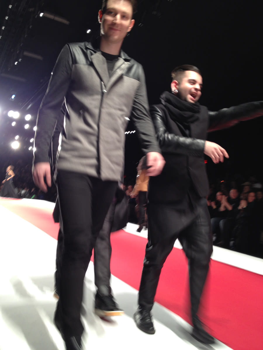 Day 3: In one of my proudest moments, three of my students were selected to show. Here designing duo German Madrigal and Ryan Edmonds mug across the runway for me right before the show.