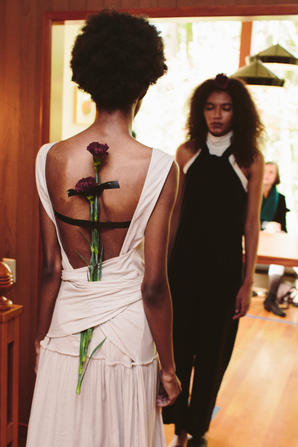 The doorbell rang signifying the beginning of the show. Models slowly walked room to room along the simple taped floor marker while nearly every one in attendance got a front row seat. Alexa Stark’s models, faces ensconced with hair, were choreographed by performance artist Sidony O'Neal using breath to “express the interconnection between all of us and the surrounding world” they softly blew their hair into the air while slowly meandering in Stark’s raw denim and minimalist looks.