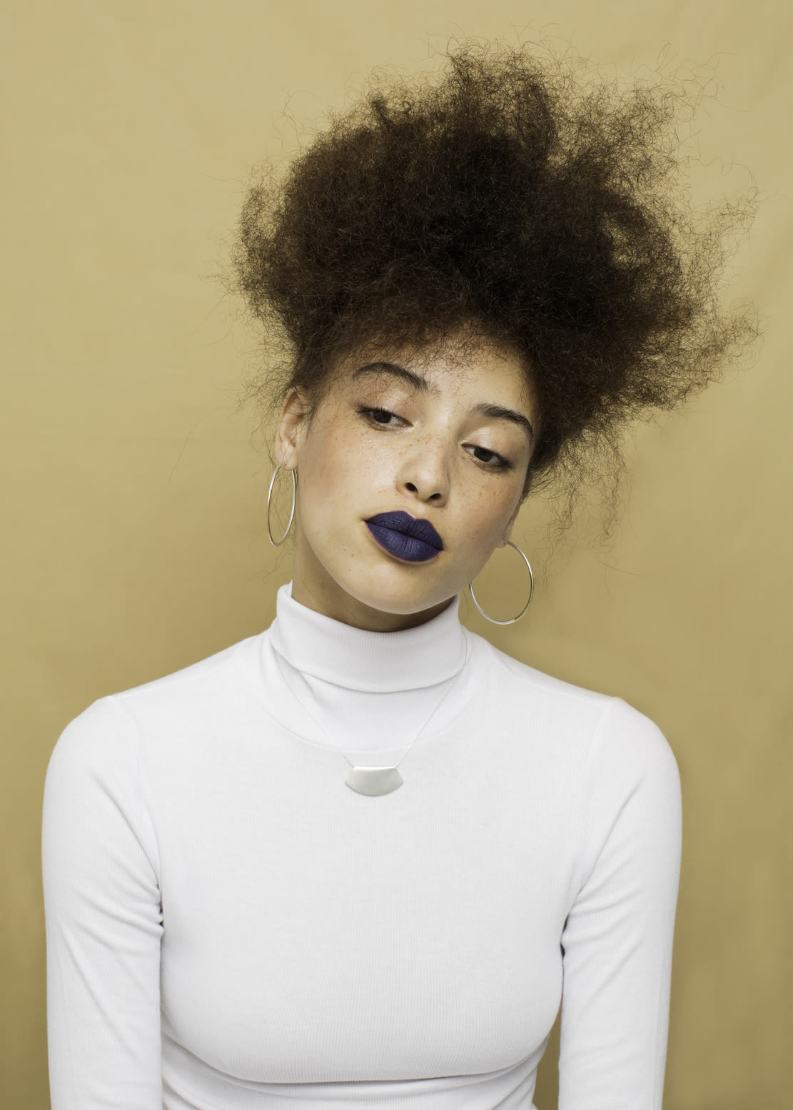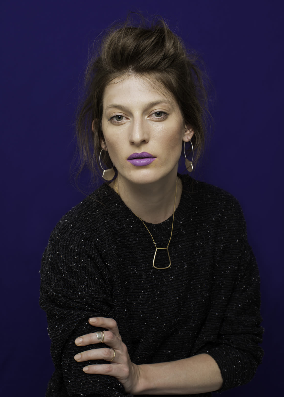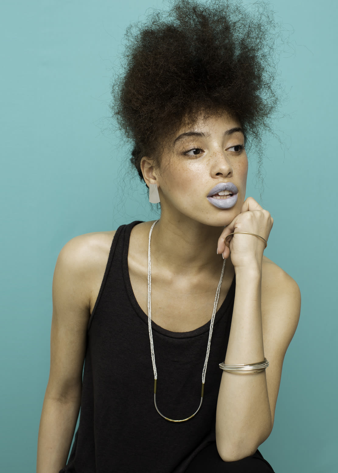Instead of the traditional one look/one model method, the B&I team have each piece shown on two, which Cross says is to inspire contrast. “The collection is very simple, minimal, classic,” she says. “So what do we do to bolster that? Throw in a bunch of color.” The vibrant hues of both background and lip color pop the simple pieces of the Unu collection so we can focus on what matters most: a killer 17-piece collection of jewelry.