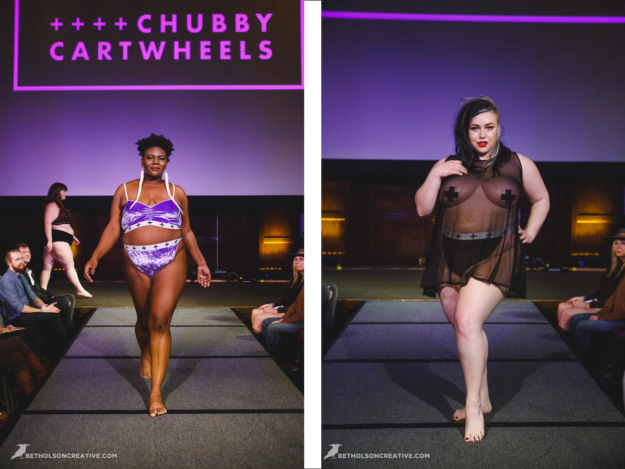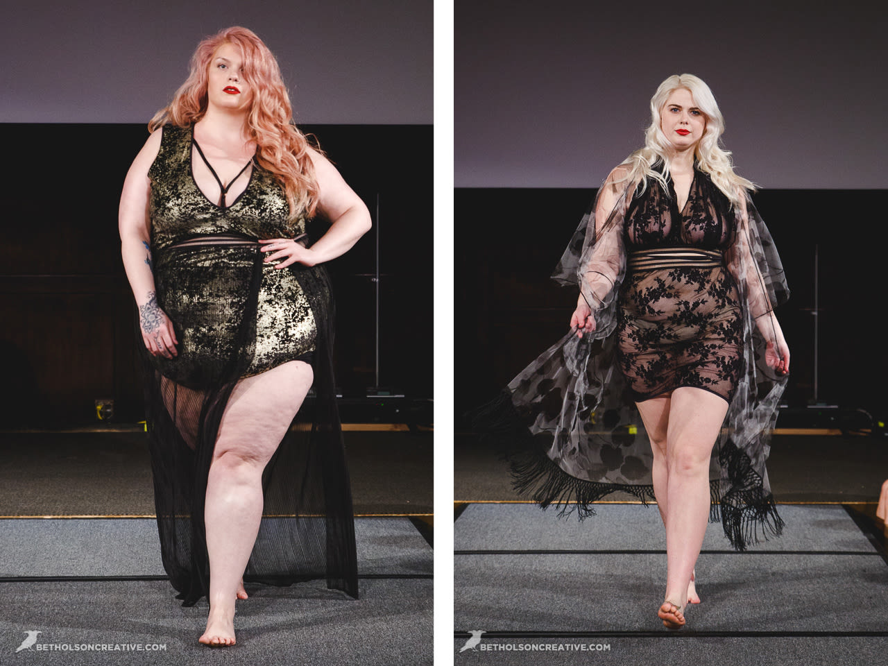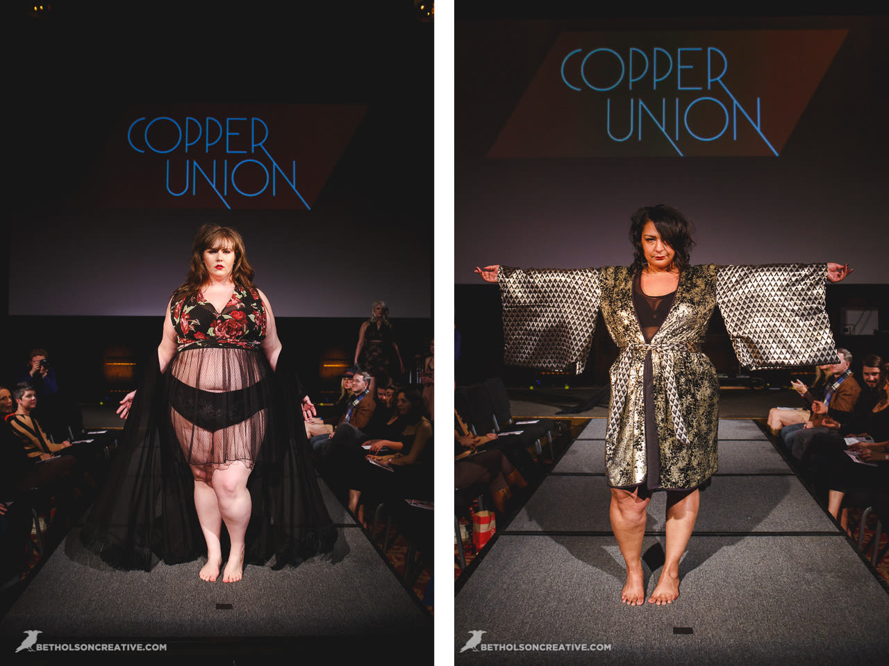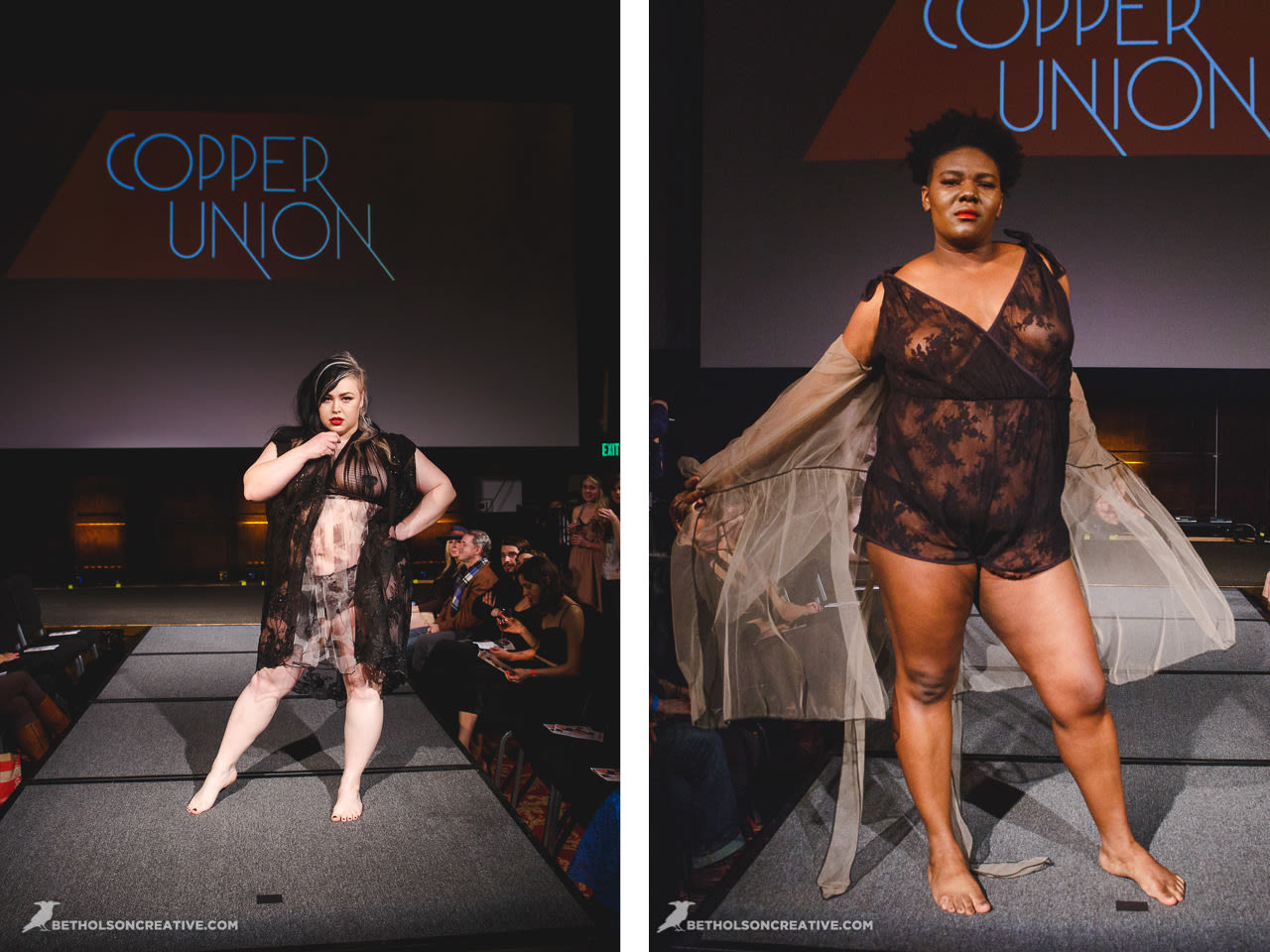 This was the debut of lingerie for beloved plus size line Copper Union. Designer Claire Doody wrapped her babes in cute sheer skirts underneath bras built to support a full bosom. The see-through layers allowed the body to be seen in a playful peekaboo way.