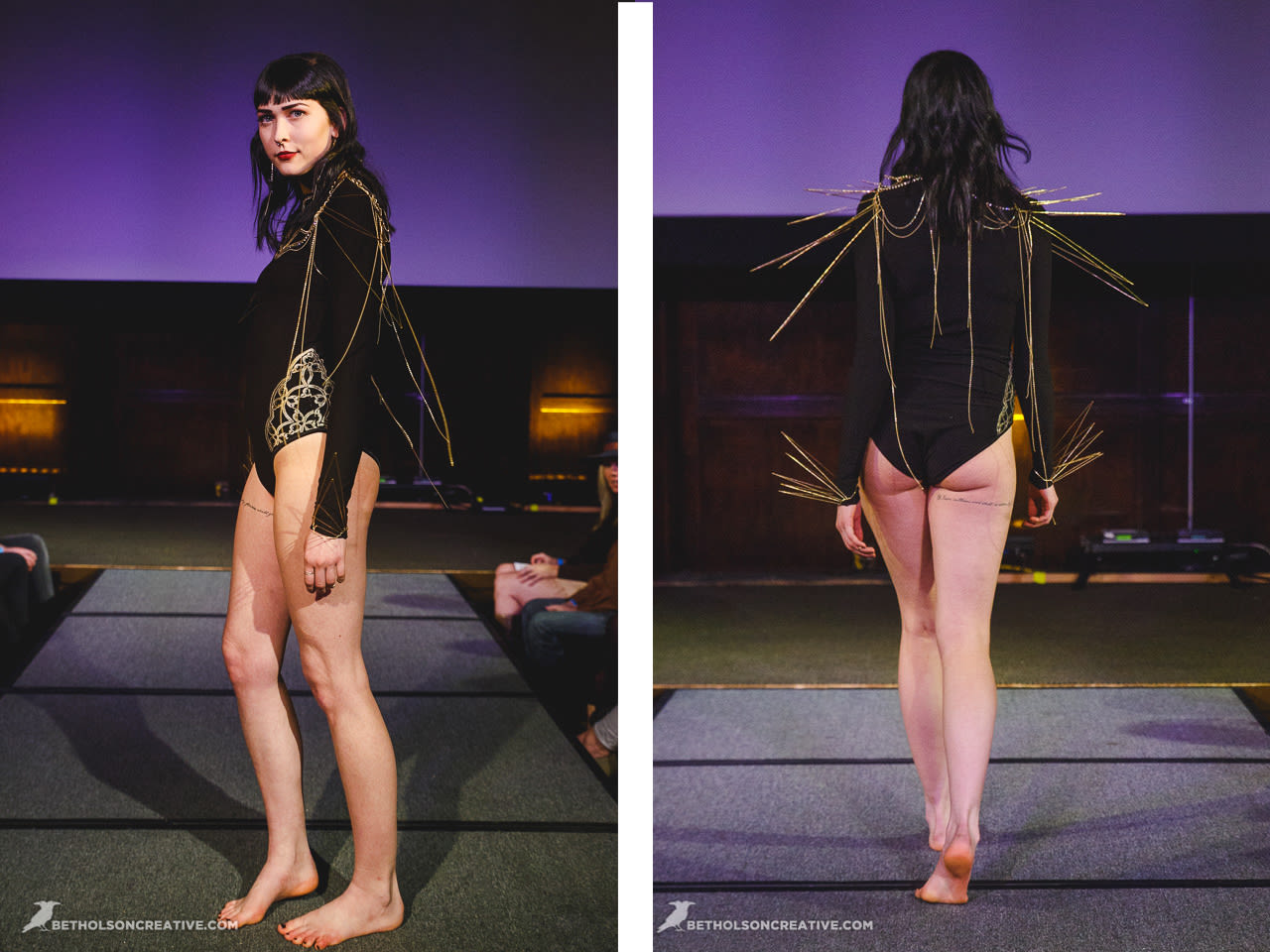 All hail the bodysuit queen. Rogue Minx takes its strengths, mixing richly textured fabric and sexy sheers, and puts it into lingerie action. The results were edgy and sexy, with the chevron metallic bodysuits burned into my mind permanently.