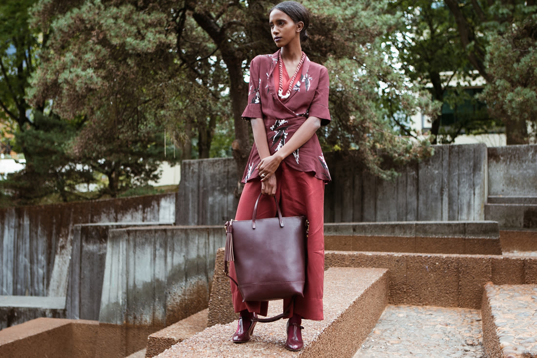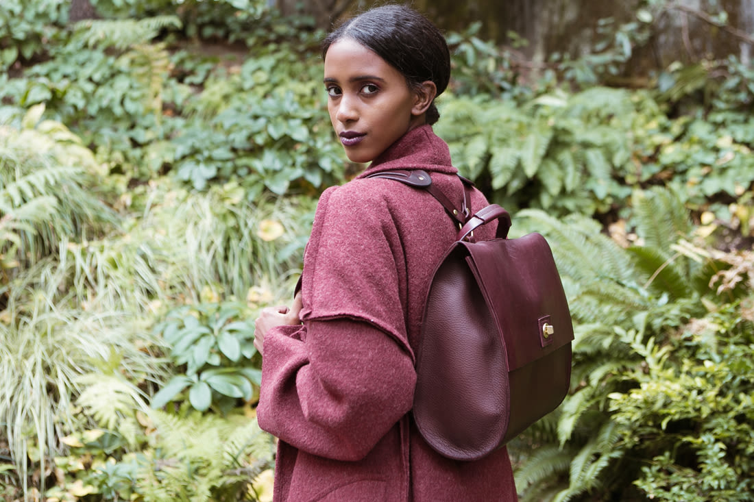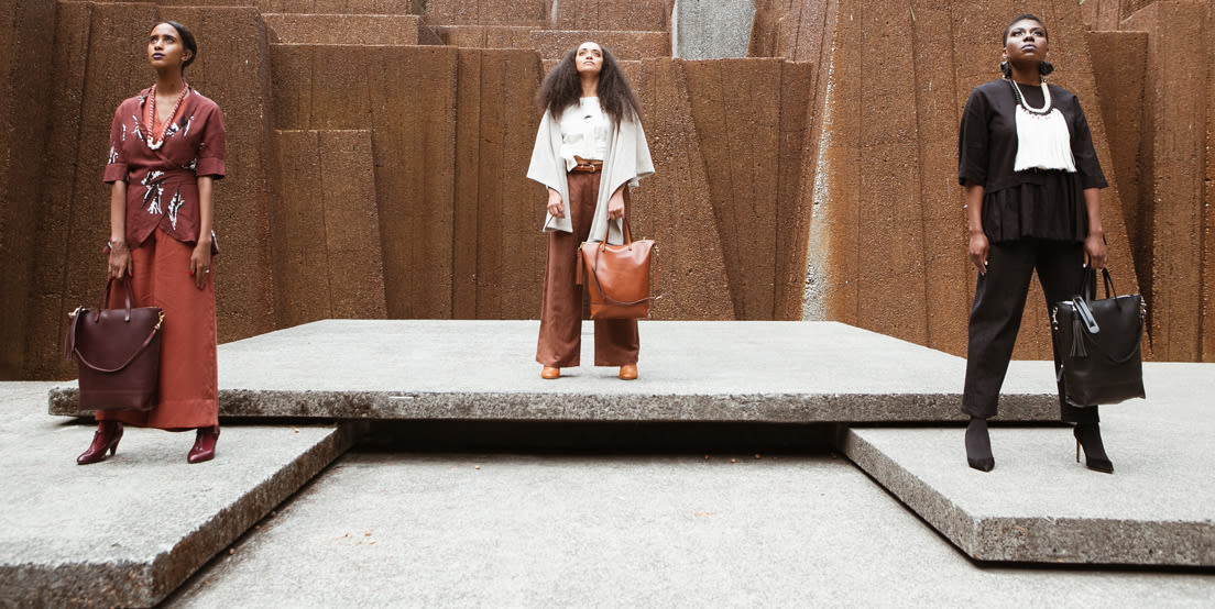 The result is a fully realized editorial piece that sets Minnie and George apart from the pack. Fringed caramel totes, buttery black envelope clutches, and berry backpacks all demand attention, even with their chic carriers and stately backdrop.