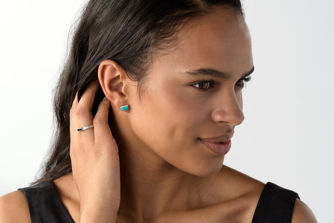 The moment helped hatch Inti, B&I’s new Incan-inspired collection: a spread of silver and bronze jewelry, embellished with fair-trade Arizona turquoise and black Oregon jasper stones, all custom cut and neatly placed using traditional Native inlay techniques.
