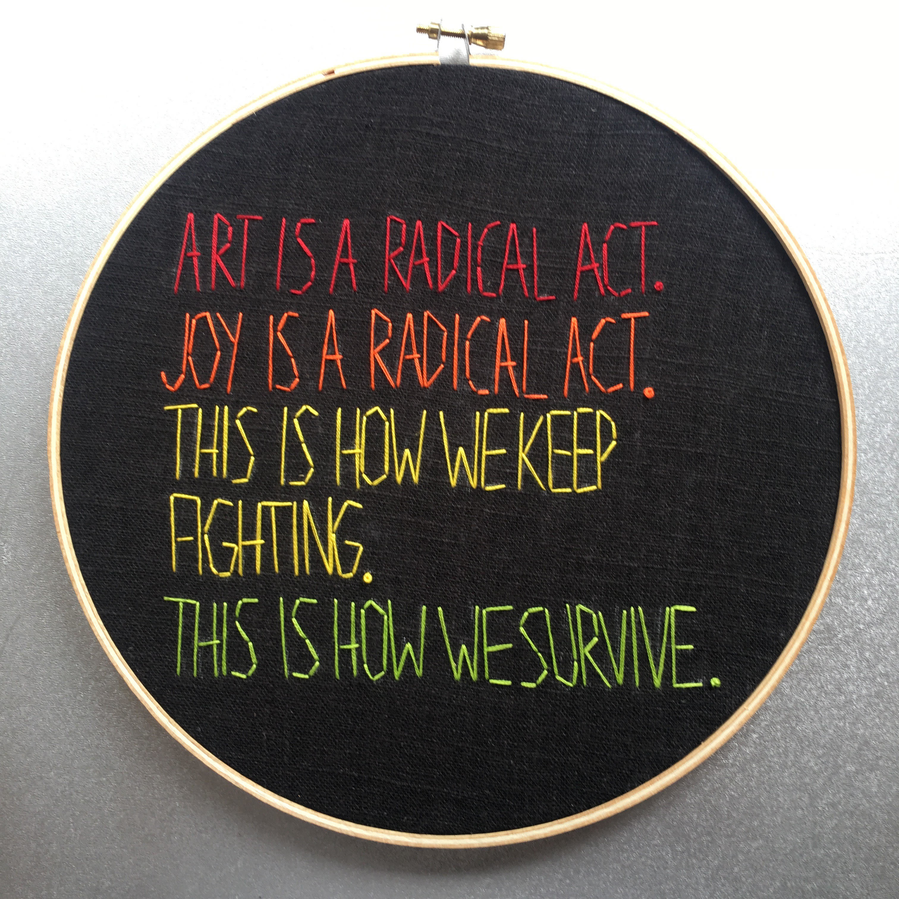After attending a political art exhibit in Los Angeles in early 2017 called Into Action, she upped her game, channeling her frustration over politics into her needle and threadwork. “It just became a really healthy outlet for my anger about what was happening in the world," she remembers. "Every time I did a political piece, I felt more confident in my abilities, but also like, this is what I was actually supposed to be doing all along.” She began selling pieces on Etsy but also leaving them stapled up on telephone poles all across Portland for people to see and feel seen by. “There's so much to be angry about politically, but there's so many people to be inspired by too. I want to inspire people to do better, with embroidery, which seems so lofty. And yet I hear from people frequently that my work does that.”