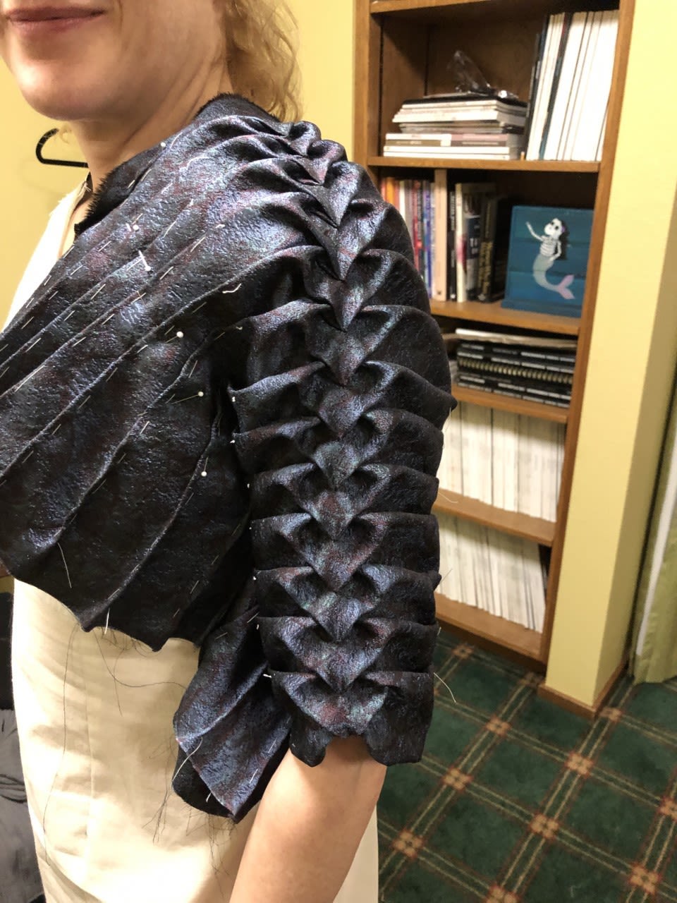 When it came time for the Oscars, Chamberlin wanted to introduce Sutner to wear a locally designed piece and began the process of finding the right fit before moving forward with Myriam Marcela, known for her meticulous tailoring and detail work. “I reached out to a few different local designers, and the person that really resonated with Arianne was Marcela,” she continues. “When I spoke with Marcela she was like, ‘Oh my god, I have the perfect fabric already!’ It was a beautiful baroque jewel-tone fabric glamorous enough for the Oscars. I then talked to her about her signature folding that she does on the sleeves. I was really confident we had a direction.”