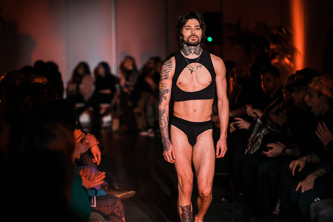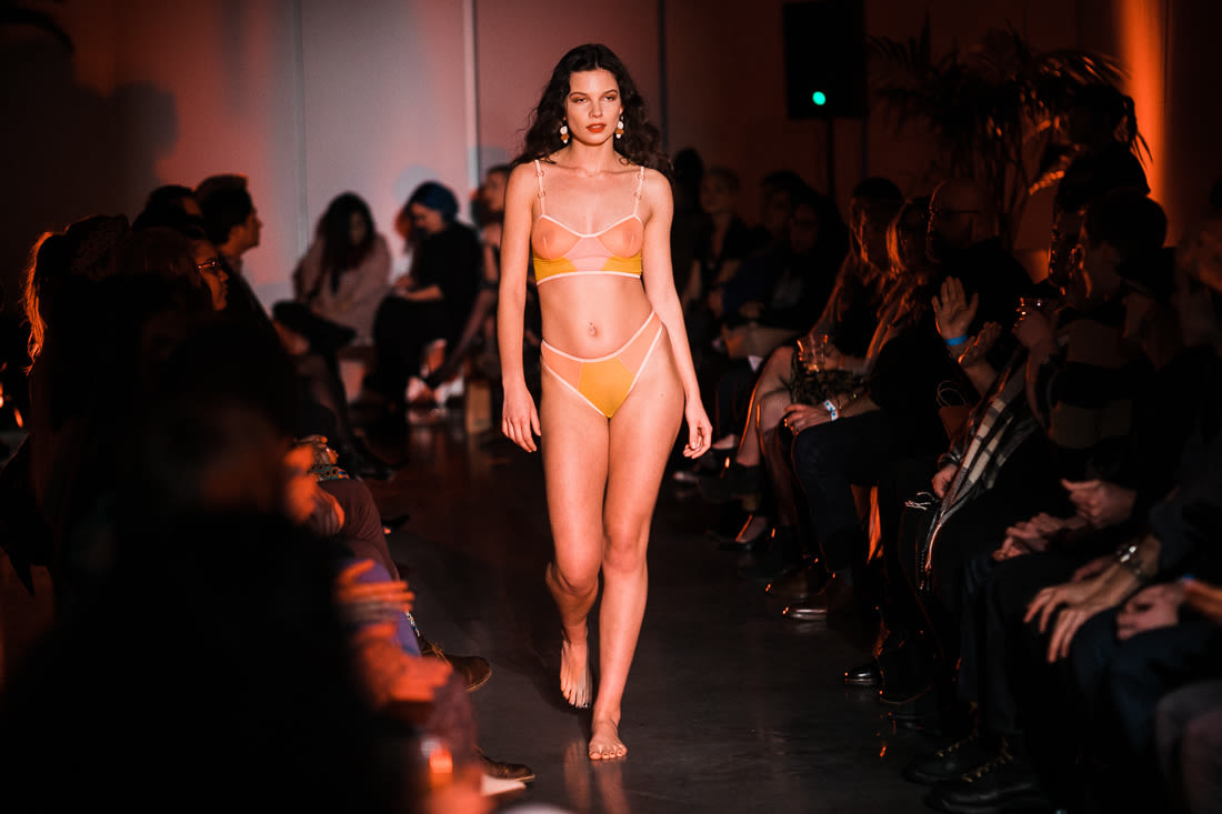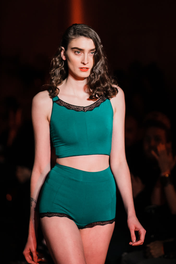 Vava Lingerie designer Alyssa Woods doubled down on her lacy black aesthetic with mesh panels and scalloped lace patched together like fantastic art deco quilts. Returning after some years of absence, Rachel Rector remains true to her signature design notes—delicate, color-blocked mesh pieces, mint maillots, and neon binding, in fun, fresh colors. Chubby Cartwheels, always a crowd favorite, offered a cute peekaboo cutout in a black bodysuit and an entire fishnet ensemble, twists on familiar lingerie favorites that rarely get to exist for bodies above a size 12. And in all the years I’ve covered fashion shows, I’d yet to see the combination of a t-strap thong and a mock turtle neck together, until Lost Boy sent it down the runway (along with garters smartly used to keep boxer briefs from riding up). Meanwhile, Thunderpants has achieved a near cult-like following since former Radish Underground boutique owner Celeste Sipes took over the USA expansion from the New Zealand company with it’s incredibly soft cotton for every day undies.