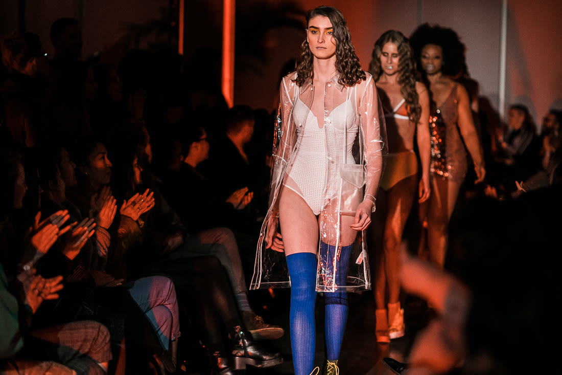 Post intermission, Tova Lis earned props with the sexy scene stealers of the evening, a color blocked mesh and maroon stretch wonder, plus an emerald green bralette and high-waisted panty. Sock it To Me continued their reign of fun patterned socks and expansion into underwear—at this point they are as much a defining Portland element as donuts and rain. One Imaginary Girl designer Sarah Donofrio segued her love of colorful silks in custom prints into a natural continuation of her womenswear line with pajamas. Striped two-piece classics, silky robes and polka dot sleep masks were all adorable. Finally Lille Boutique headlined, as they do every year, with an emphasis on exquisitely made independent lines sources from all over the world. A delicate white body suit with underwire cups under a see-through rain jacket was particularly chic.