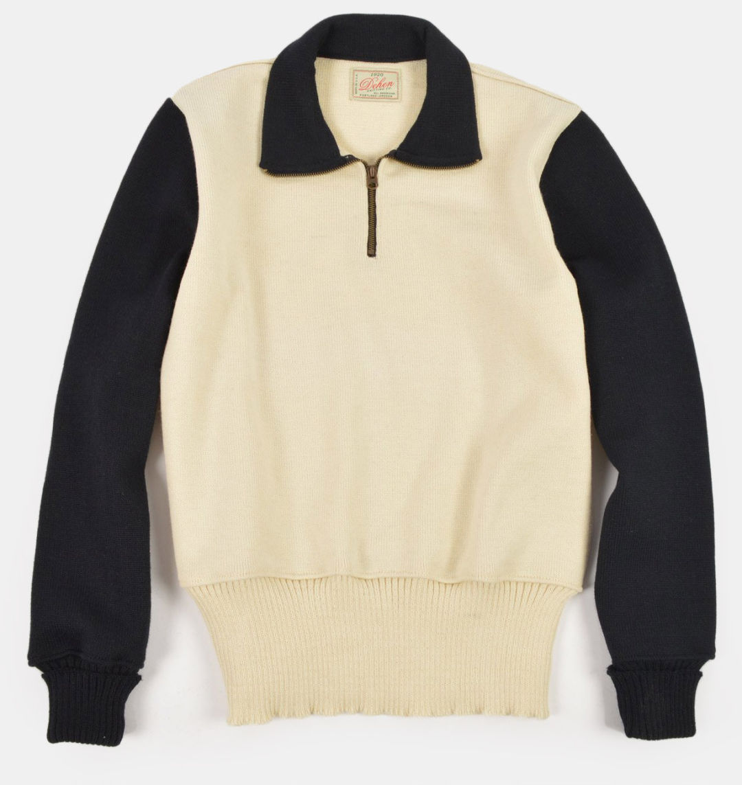 You know the boots (harnessed at the ankle) and that iconic rider jacket Marlon Brando made famous, but what of the motorcycle sweater? A biker’s woolens? Once a burly outer layer warm enough for any stretch of open road, the quarter-zip turtleneck evolved in the ’30s to ride below leathers, with an extended hem and cuffs. It’s coolly blousy, flowy in the shoulders and cinched at the waist, like something Marc Bolan or Mick Jagger would wear, androgynous and loaded with a century of oil-slicked lore. So why don’t we wear them, especially considering that Portland’s Dehen Knitting Company has been the biggest name in motorcycle sweaters for decades?