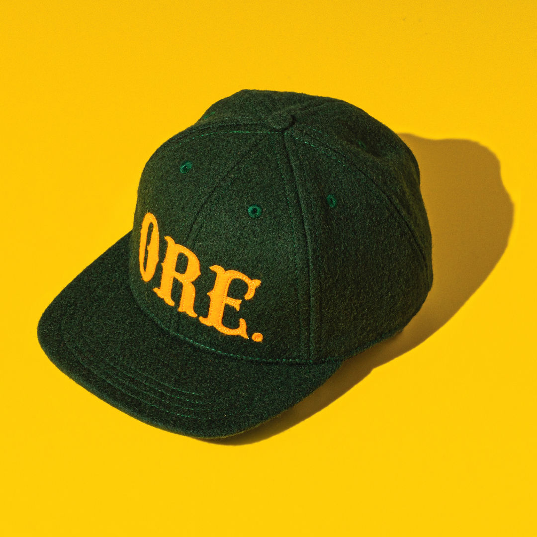A baseball cap warm enough for winter. Made with Melton wool, the hat is both sturdy and toasty enough for blustery, below-freezing days. Dehen's legacy of midcentury letterman jackets and cheerleader uniforms is clear in its nostalgic feel, and the leather strap and nickel clasp give it a designer edge—quite the upgrade from the basic Oregon Ducks cap.