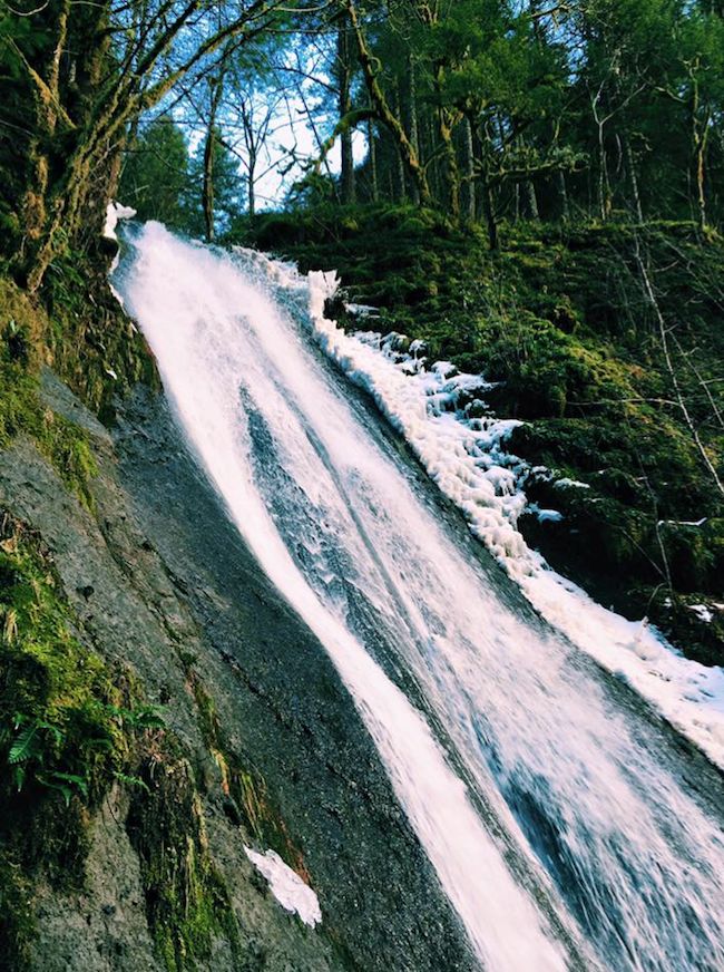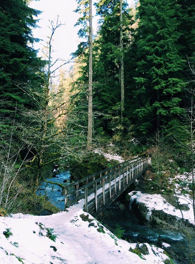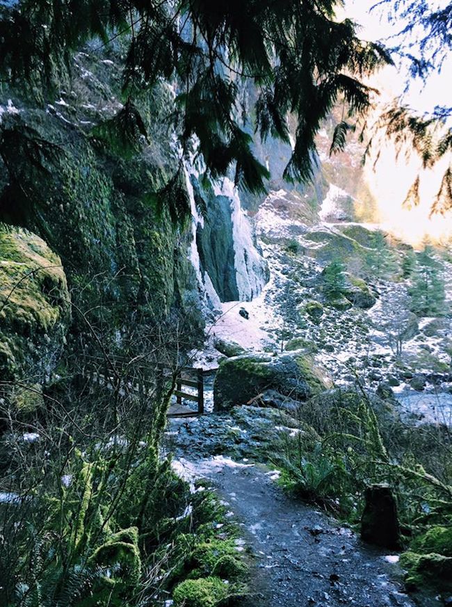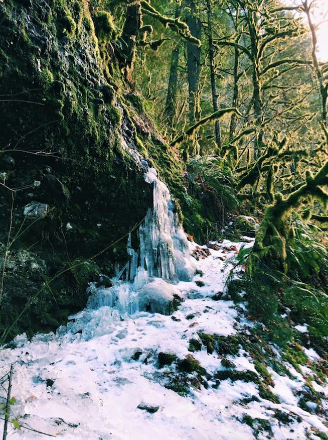 After leaving my home in Southeast Portland around 9 a.m., I reached the trailhead in just 35 minutes. The small, circular parking lot was empty, save one or two cars (the Wahclella Trailhead requires a National Forest Park Pass or the onsite purchase of a $5 day pass). The sun not yet fully out, the road remained icy from last week’s snowfall, and I strapped small crampons onto my boots to make the two-mile round trip all the easier.