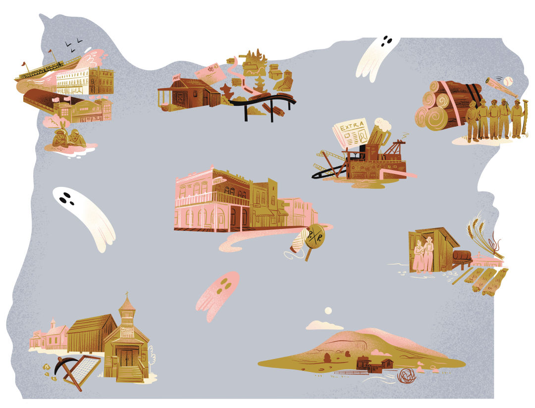 according to some counts, Oregon is home to more than 200 ghost towns— bygone settlements that hold tales of high hopes, dashed dreams, and booms gone completely bust. Here are eight that span the state, a few of which can still be visited today.