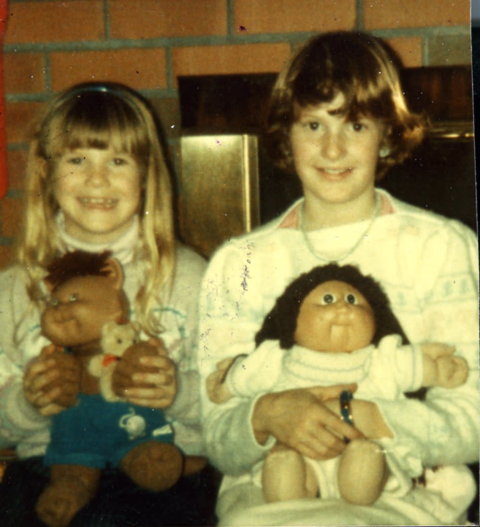 Senior editor Kasey Cordell (left) with her sister, Tami, in full 1985 sweater and turtleneck regalia. They are accompanied by a Cabbage Patch Kid and its ugly cousin the Koosa (names withheld).